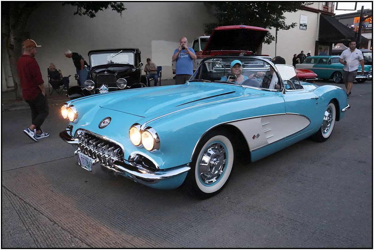 The car lights are on, because it was getting dark. The sun hadn't quite set yet, but was close to doing so. The ISO level was high for that reason. That's a 1960 or 1961 Corvette.