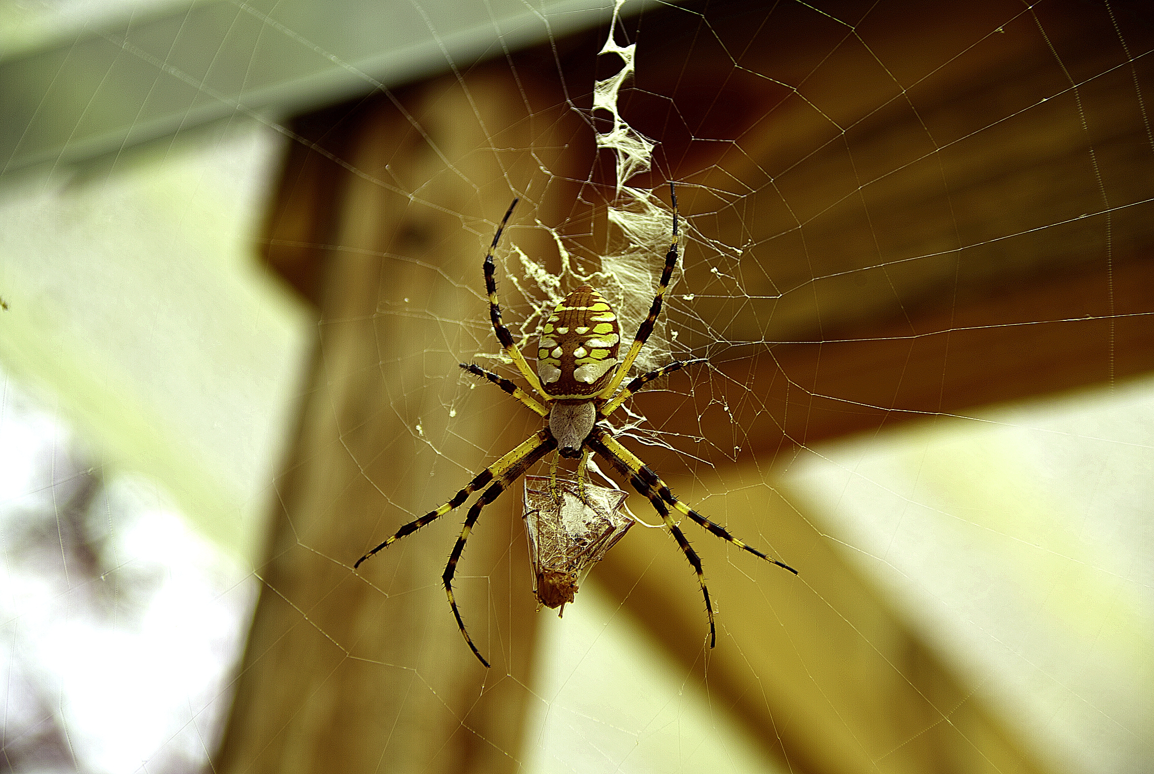 Here's an Orb Weaver spider from my porch long ago, packing up it's lunch - a Daddy-Longlegs:
