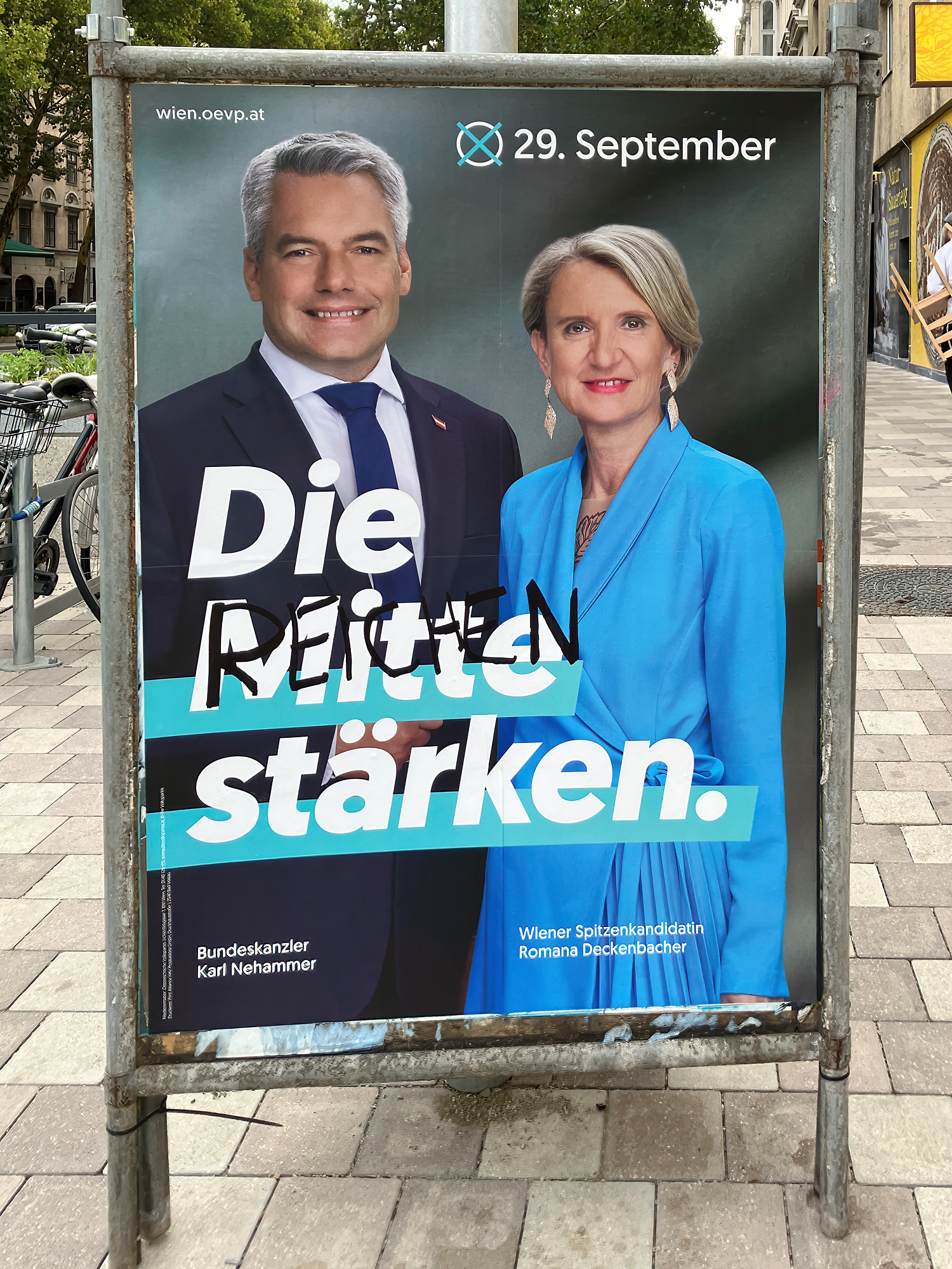 The other day, I saw a poster for the VPÖ. The white writing means "Strengthen the centre", but someone has inked it in black to make it read "Strengthen the rich", and I have to say that wearing what looks like a very expensive pair of ear-rings is perhaps asking for such comments...