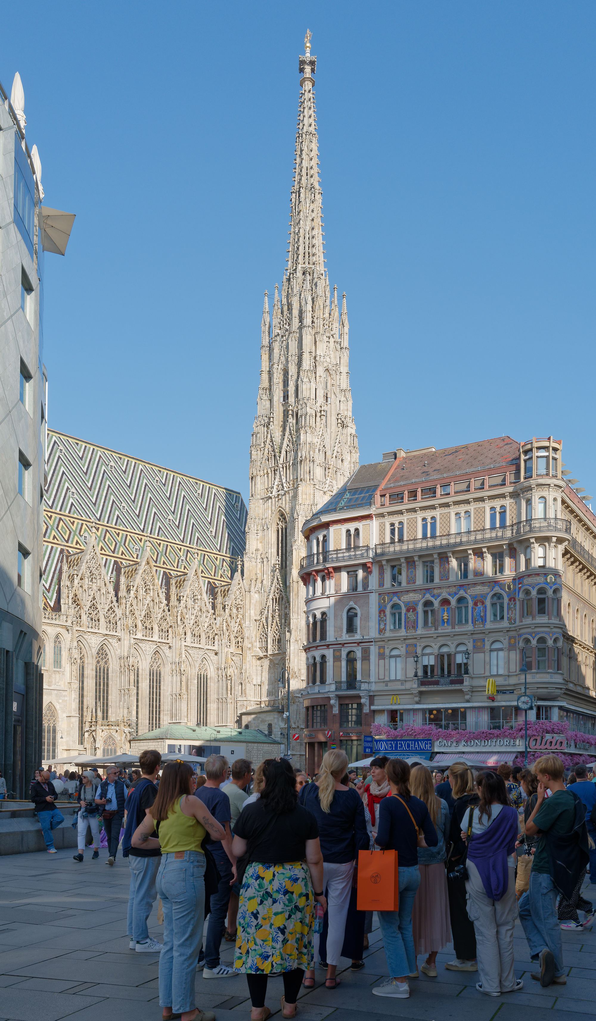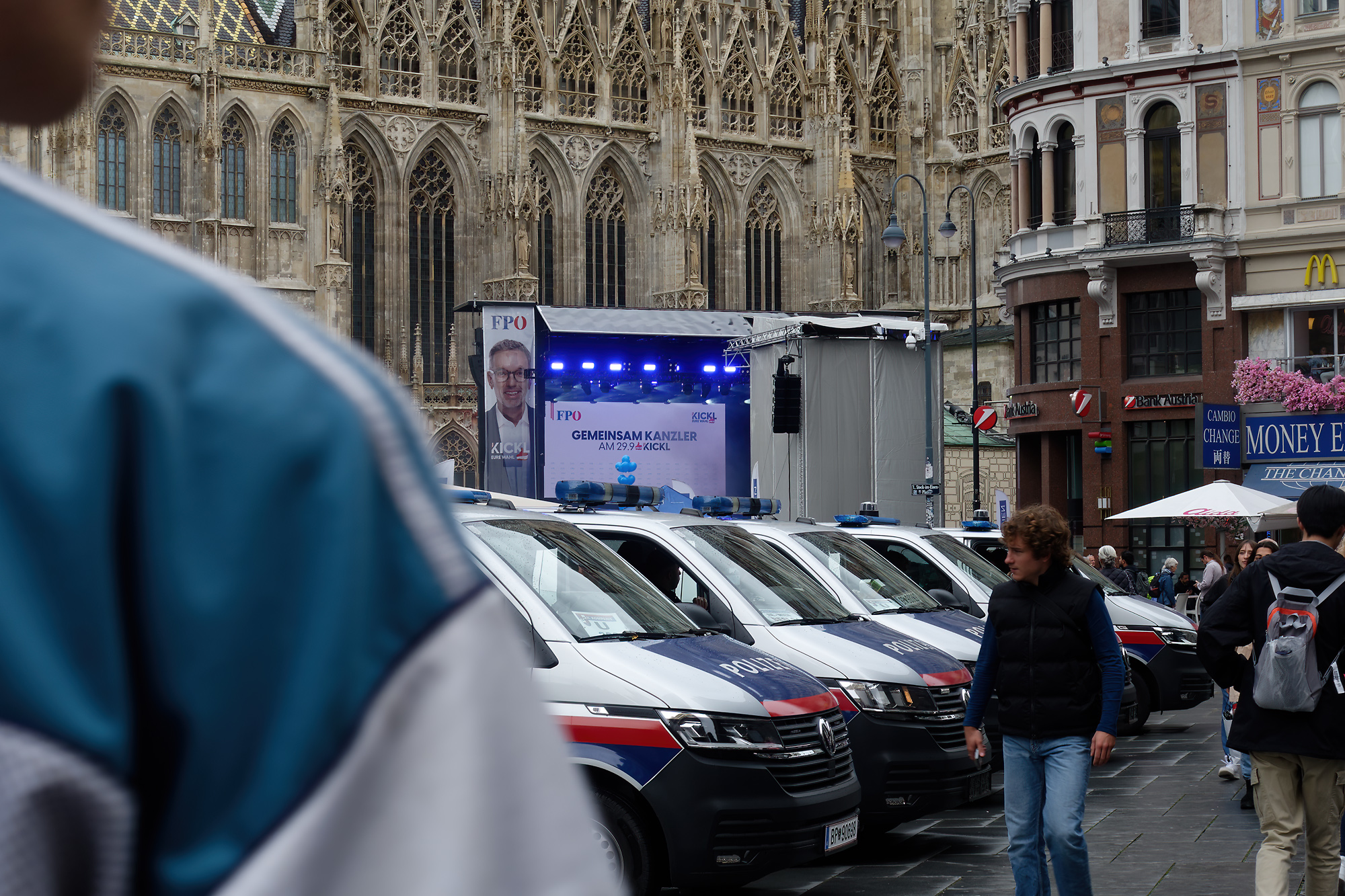 It turned out that all seven Austrian political parties were having their last rallies today and tomorrow at different places in the city -- kept apart by the police -- before the general election on Sunday. When I took the above photo it was around 2:45pm, the police were already in position, and the stage was set up for the band to perform at 4pm, followed by a speech by the FPÖ (Austrian Freedom Party) leader at 6pm. I was just passing through, and I wondered how the FPÖ had managed to bag the best spot in town; but polls have put them at 27% of the vote, with the VPÖ (Austrian People's Party), which forms the current government, on 25%. If these figures are indicative, a coalition between the two parties is likely, with Kikl as Chancellor. Given that the FPÖ are extreme right wing -- the UK newspapers have actually described them as Neo-Nazis -- feelings are high.