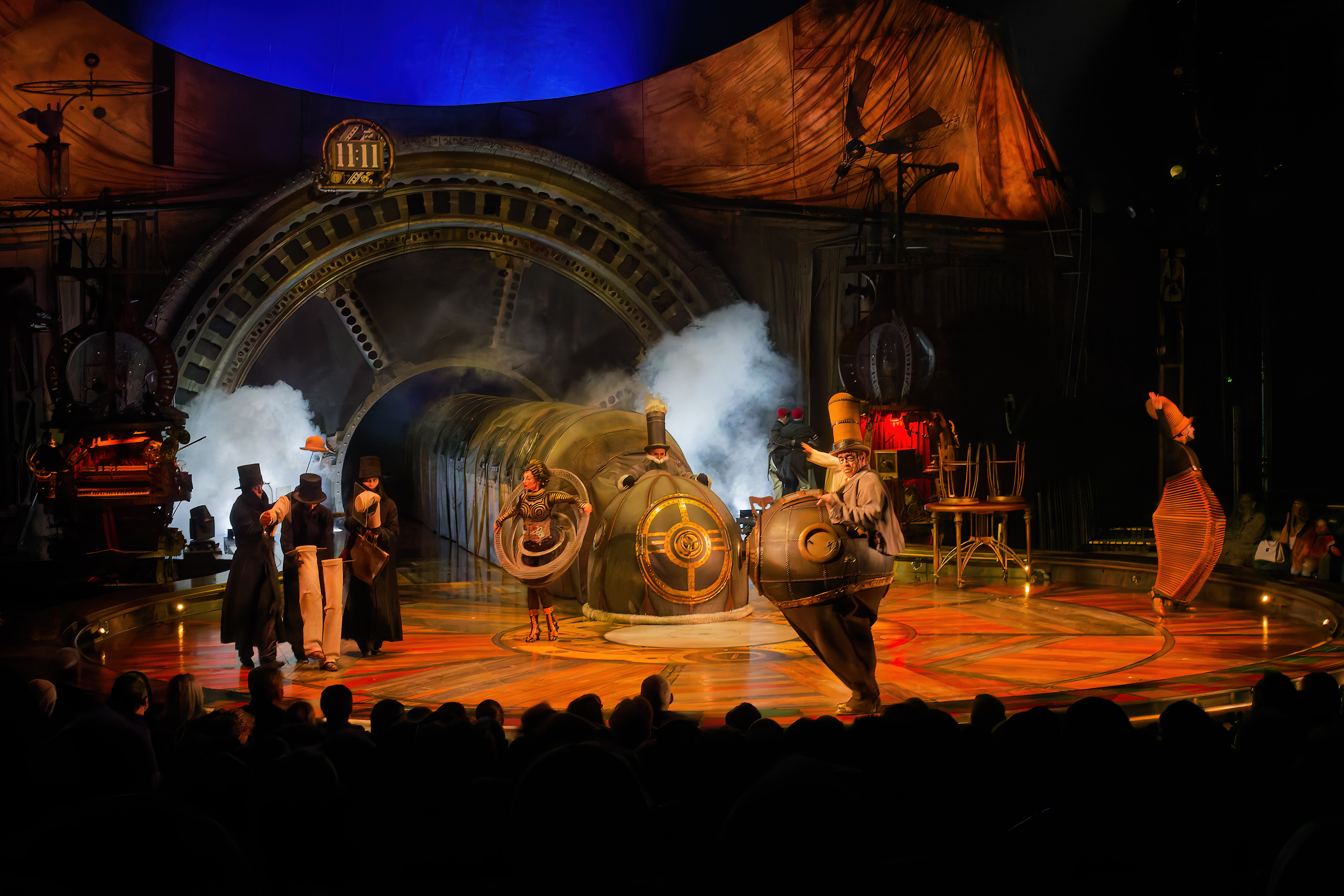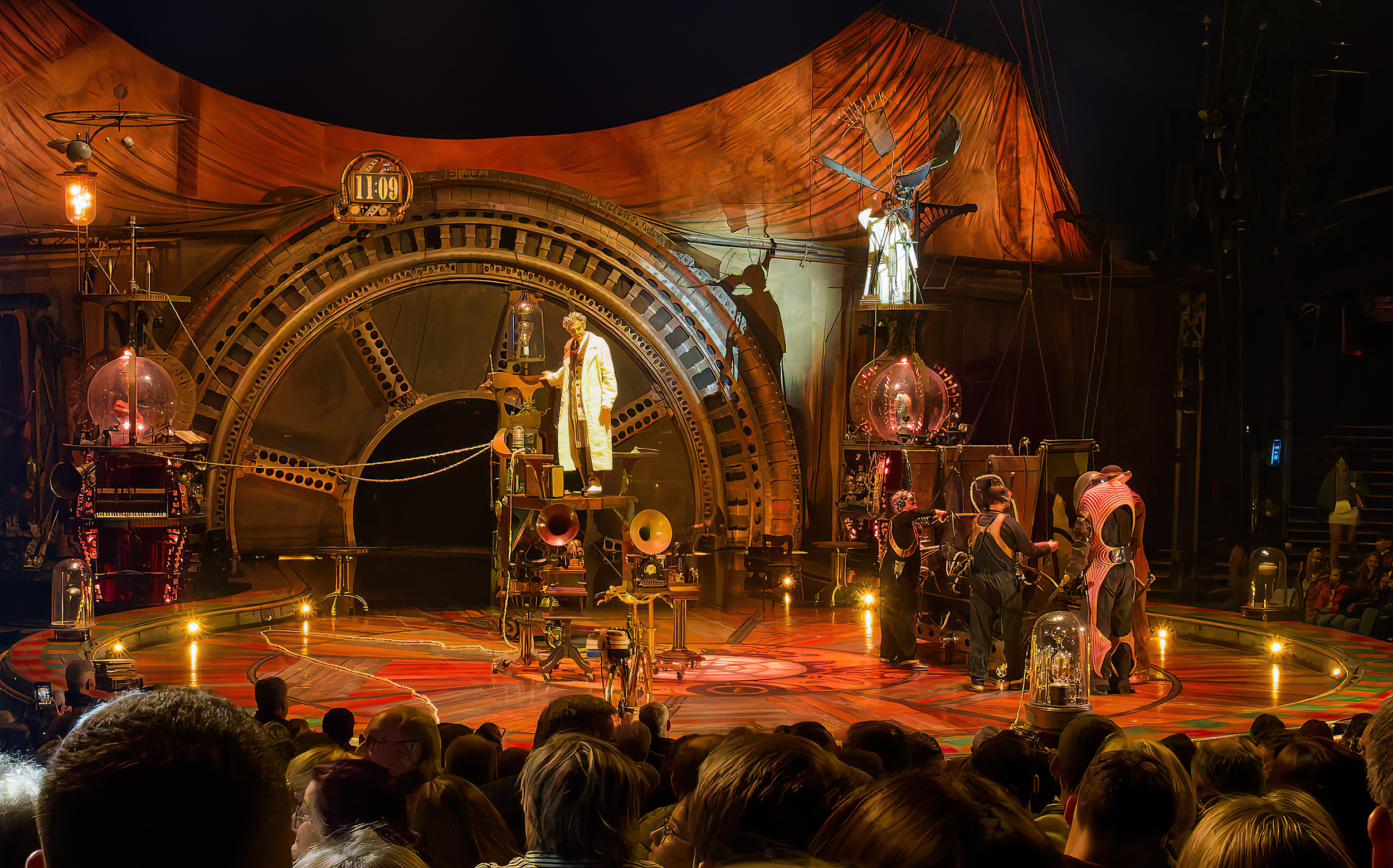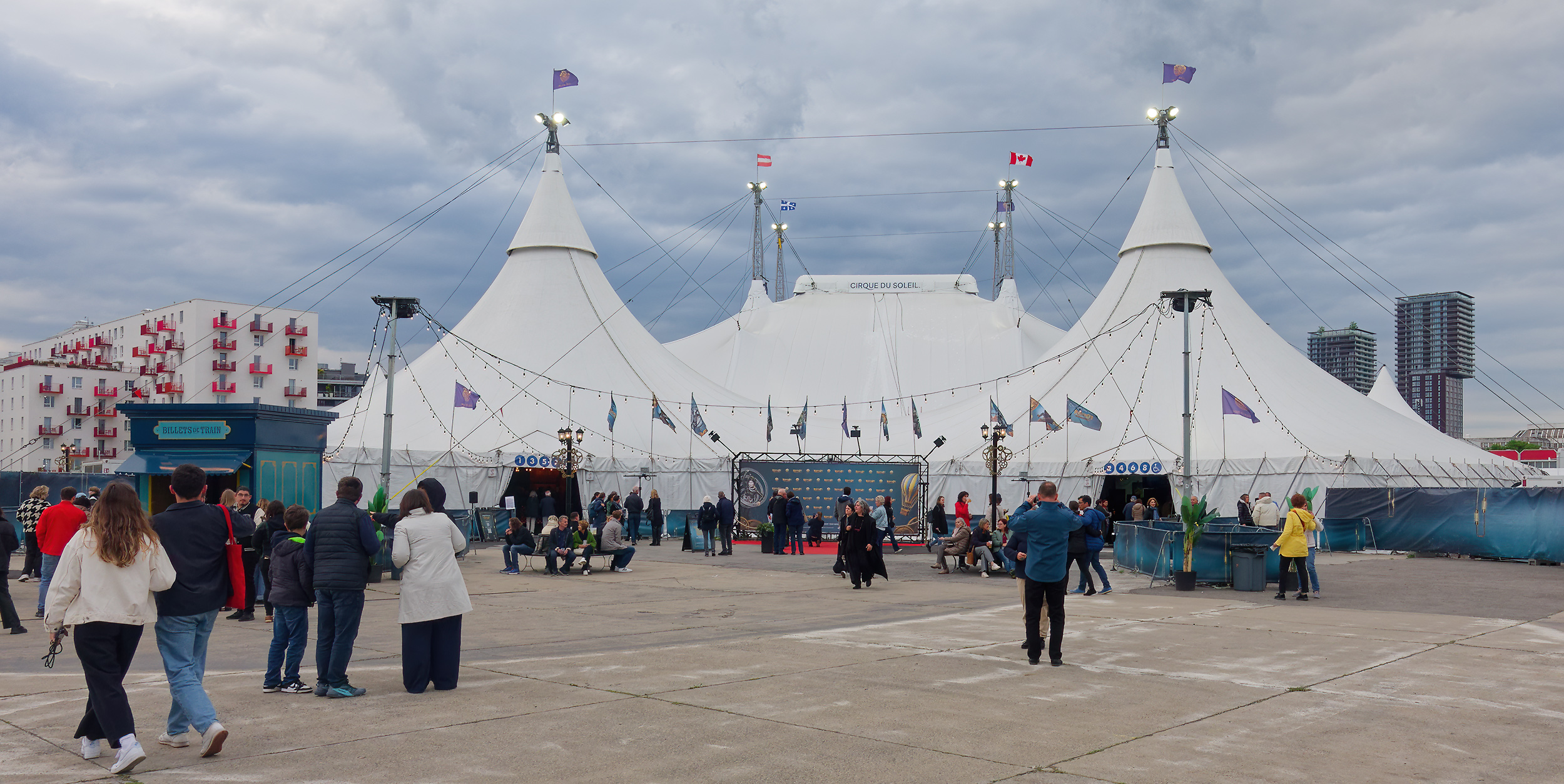 Last night we went to see the Canadian Cirque du soleil, which has been in Vienna for a few weeks. The large tent had been pitched in a remote and largely desolate part of town, by one of the large Autobahn interchanges. (There is a lrge hardware store there -- like the US Home Depot which is usually the only reason to visit.) The weather was overcast, as can be seen in this photo, which also shows the Austrian and Canadian flags atop the tent.