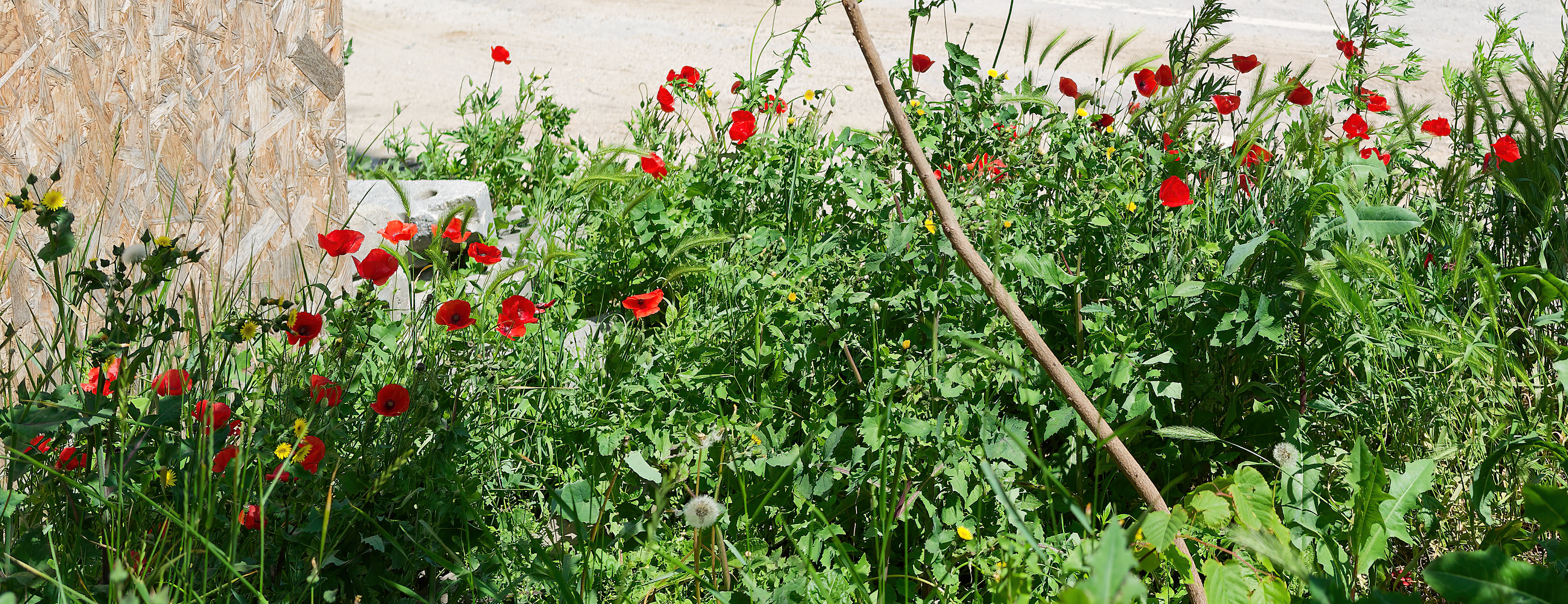 A little further down the street were roadworks, where volunteer poppies have come up. The recent VE Day (yes, on the 8th -- you were right, Digi) makes these very topical.