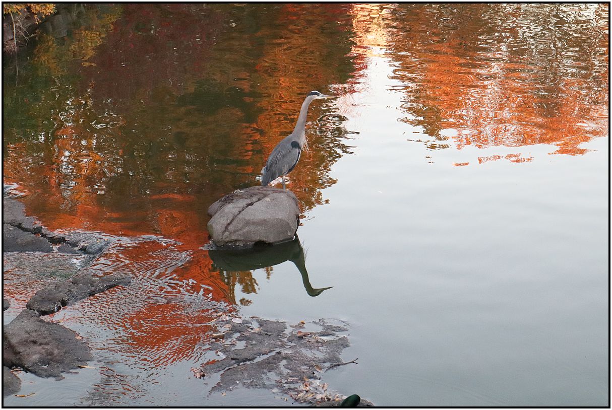 Here's some photos I already showed on another photography forum in part. But this is better in that I show photos from two cameras together, to give you all a better affect of what I saw and photographed. Just after I took pictures of the white duck and others, I was ready to go home. The sun was setting. Then this heron flew by and landed on a rock near where I was standing. I was standing on a pedestrian bridge that I show on the first image. The heron was on the right side of that pedestrian bridge. Well, now I could not go home. So with good techniques, I was able to keep the cameras steady enough with relatively low shutter speeds, to capture this unique opportunity. What was unique about this was the sunset reflection that I initially captured in the background. I've never seen anything like it with both a heron and sunset reflection together and don't know if I will in the future.