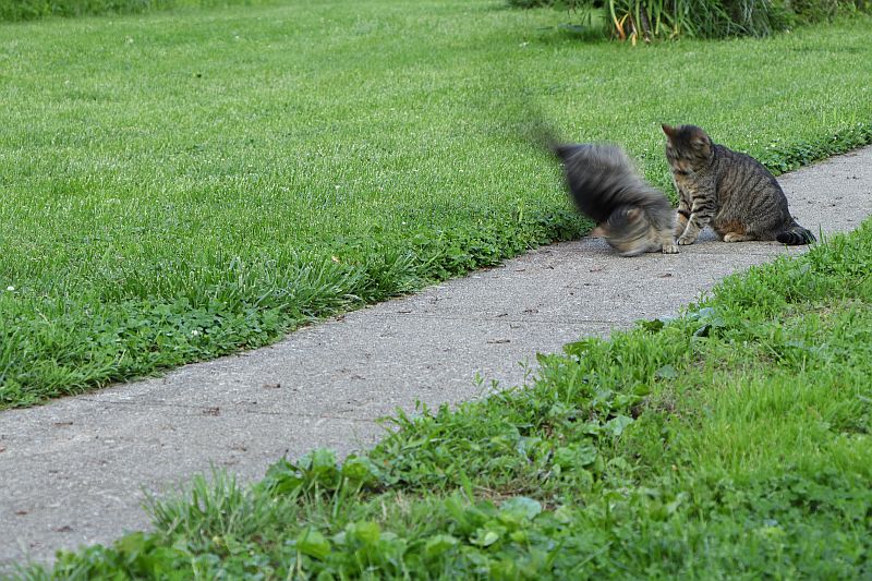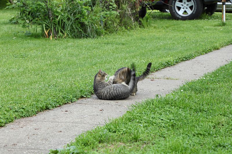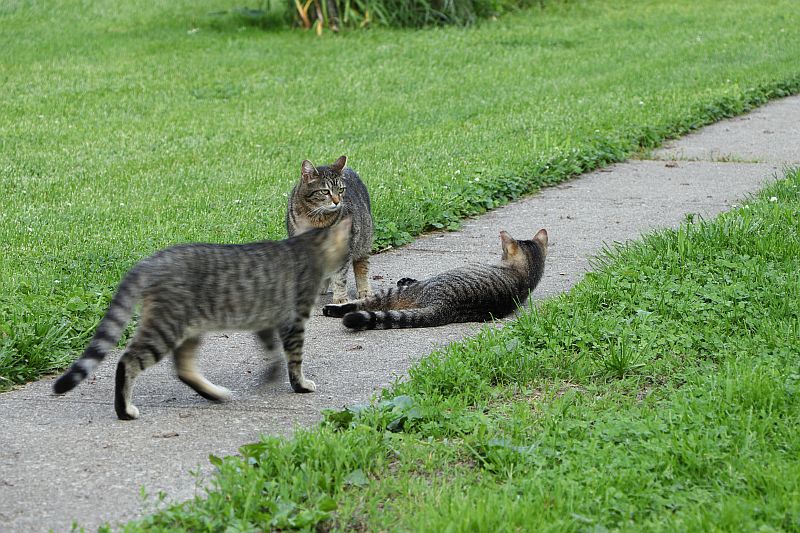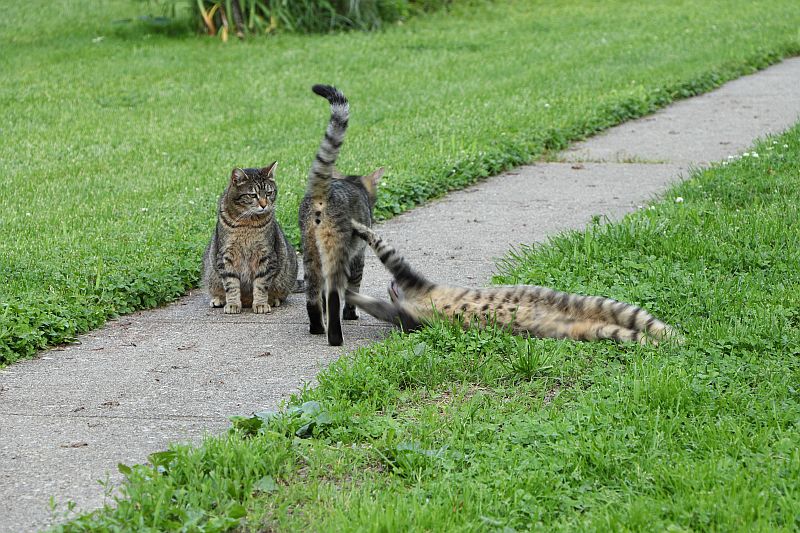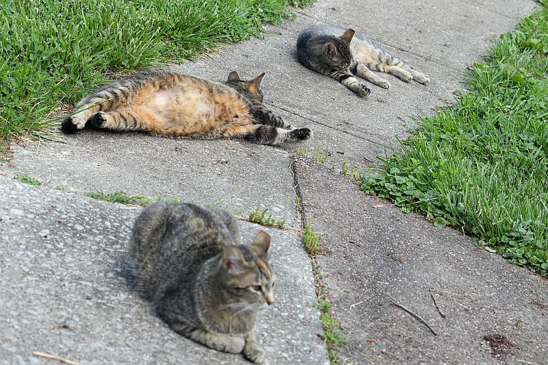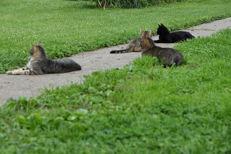 That's a family that showed up last spring. We nurtured them through the winter, and they decided to stay. We had them neutered and spayed so there won't be any more. They're kind of fun to have around.