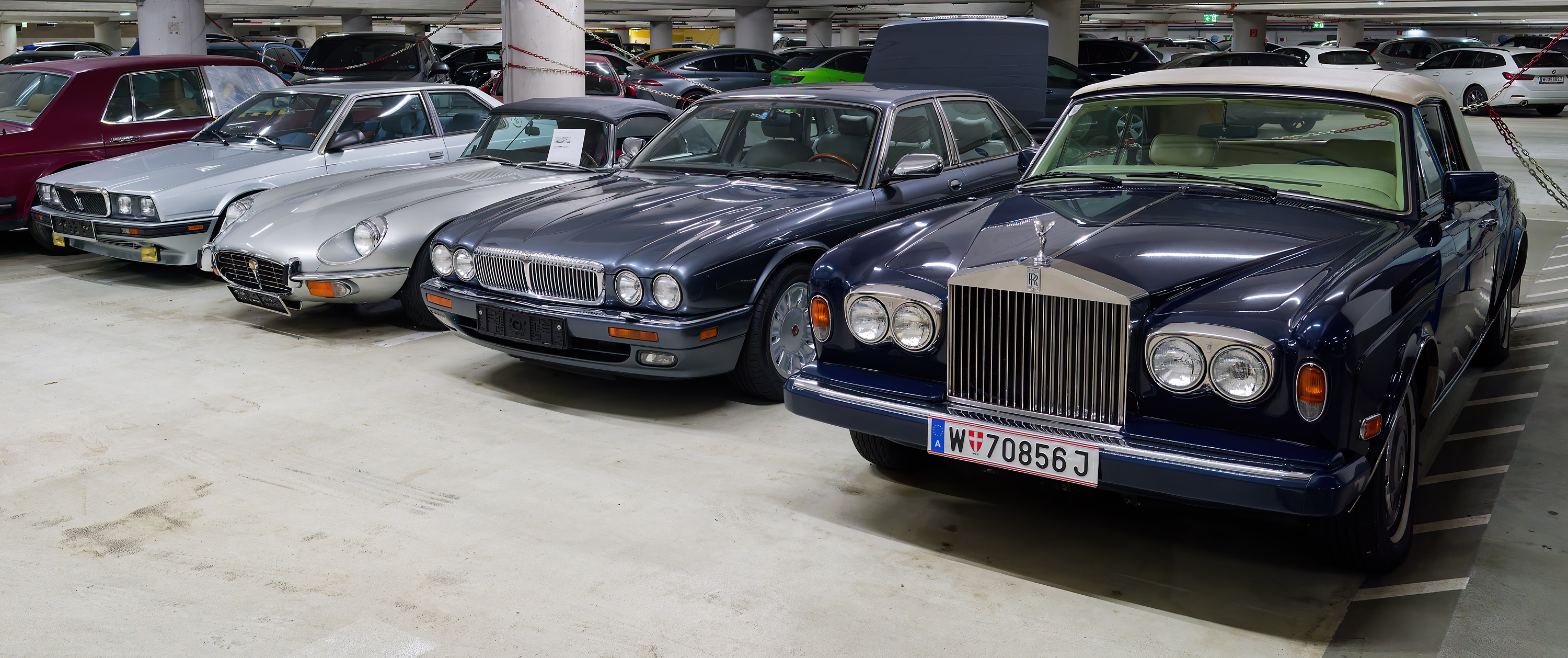 I was amused to see these four expensive cars next to each other. From the right: a Rolls Roye, a Daimler, an E-type Jaguar and a Maserati. It looks like they may all be for sale.