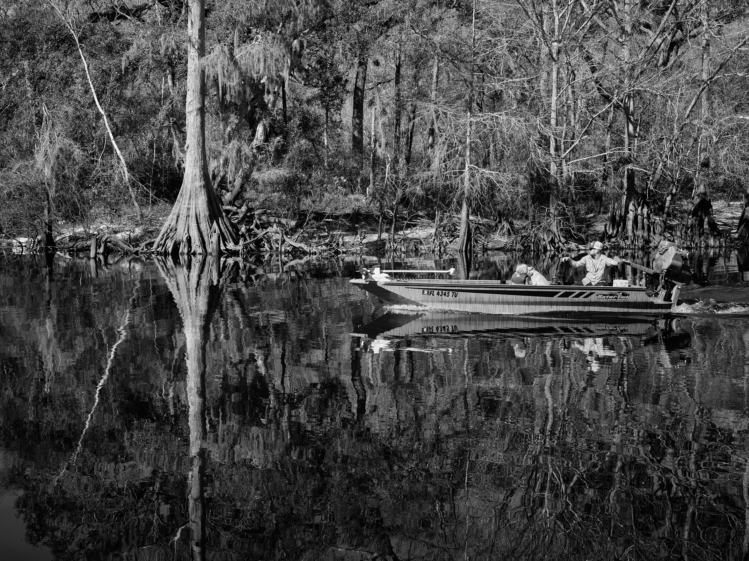A very cool image. The slightly rippled reflection makes for a nice impressionist part of the picture, the boat has lots of space to move into and the big tree on the left looks interesting with all its roots. Then there is the story about the father in the boat taking his daughter and their dog for a ride along the river.