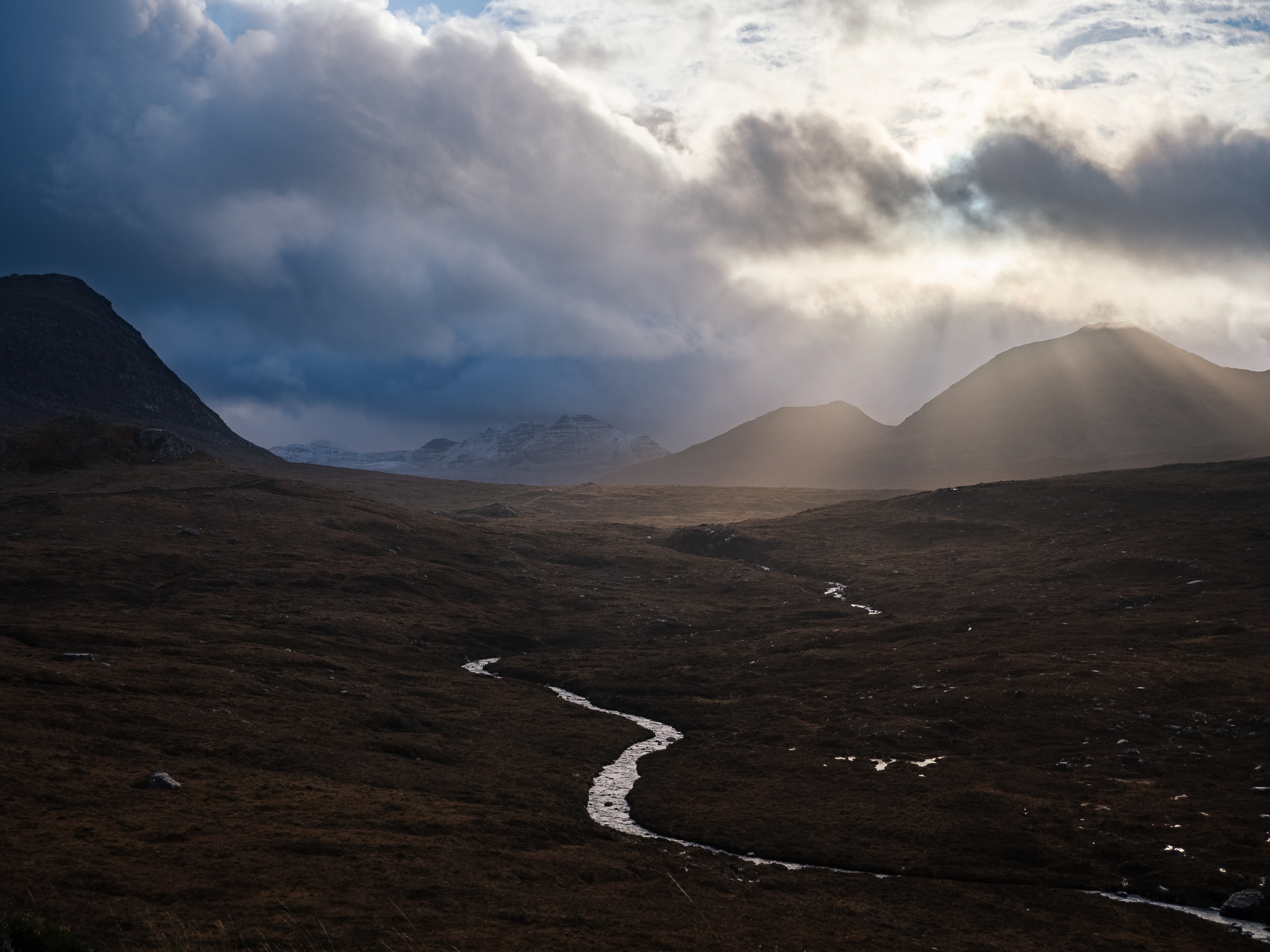 In this one the land is fairly dark, but we still have just enough shadow details to see the texture of the land. Against that dark background we have the very bright "hole in the moody sky", where the sunlight is pouring though and creating sun rays in the haze. That light is also reflecting on the stream so it looks bright and silvery in the dark fields. I can follow the stream all the way back in to the distance and find the snow capped mountain :-)