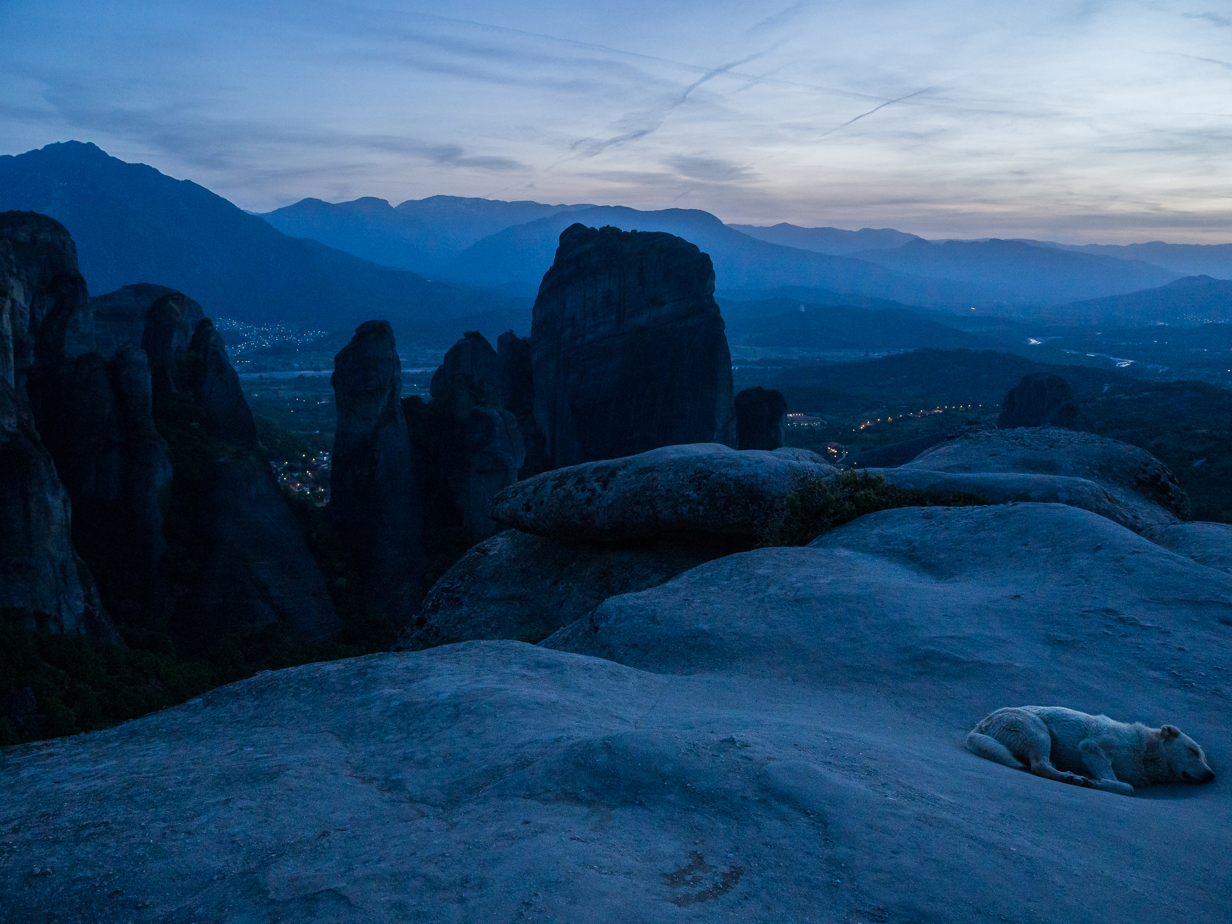 This area in central Greece is known for its rock formations and perched monasteries. This is a favourite spot for sunset chasers, and there were maybe twenty or so people all taking selfies on the adjoining rock. Meanwhile a local stray dog was basking in the warmth from the rock heated during the day. I had to frame it with the dog a bit too close to the edge of the frame due to the other none-too-picturesque photographers.
