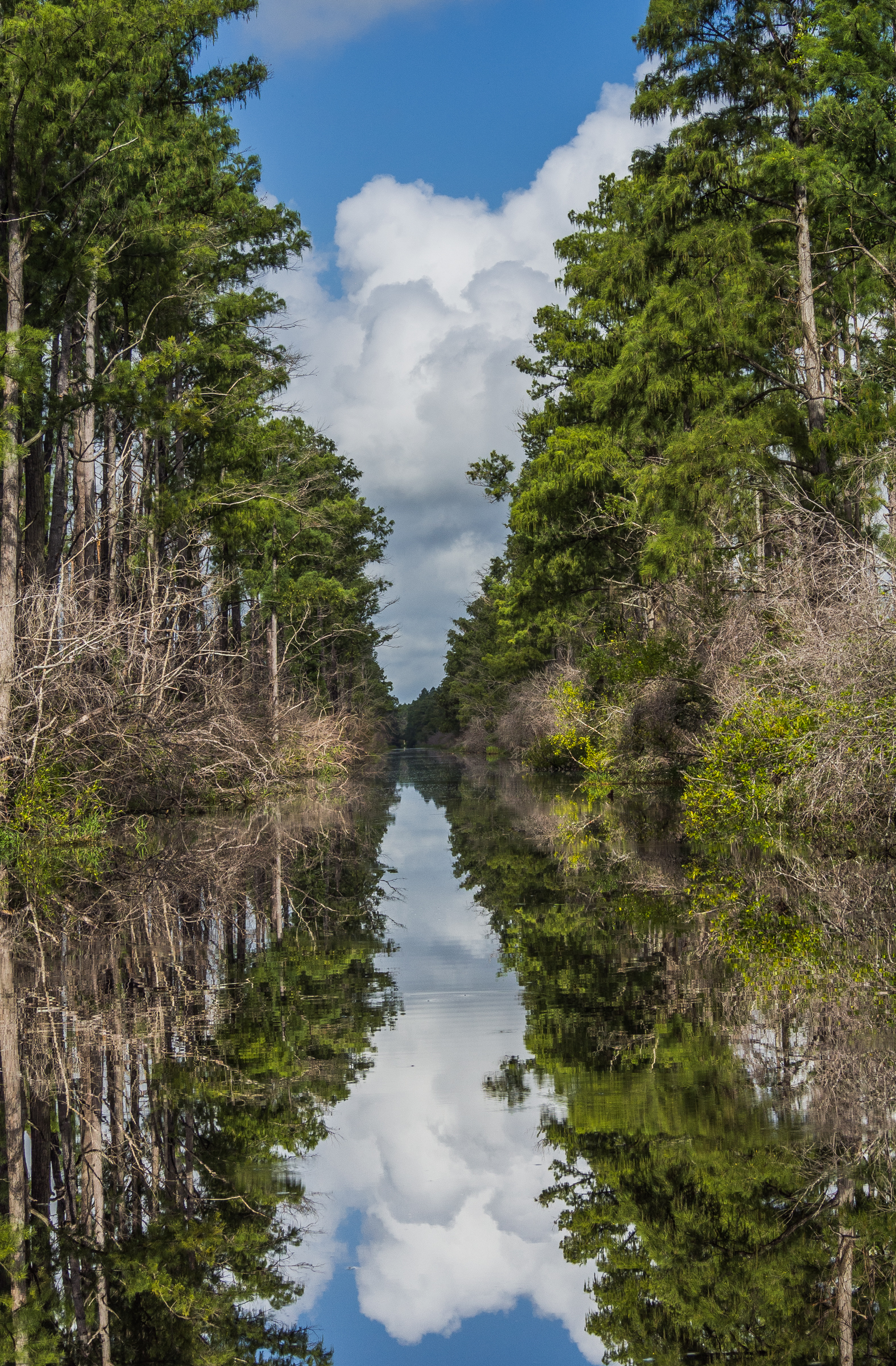 This vertical view of a long straight river with high "walls" and it's reflections reminds me a bit of being in a gorge.
