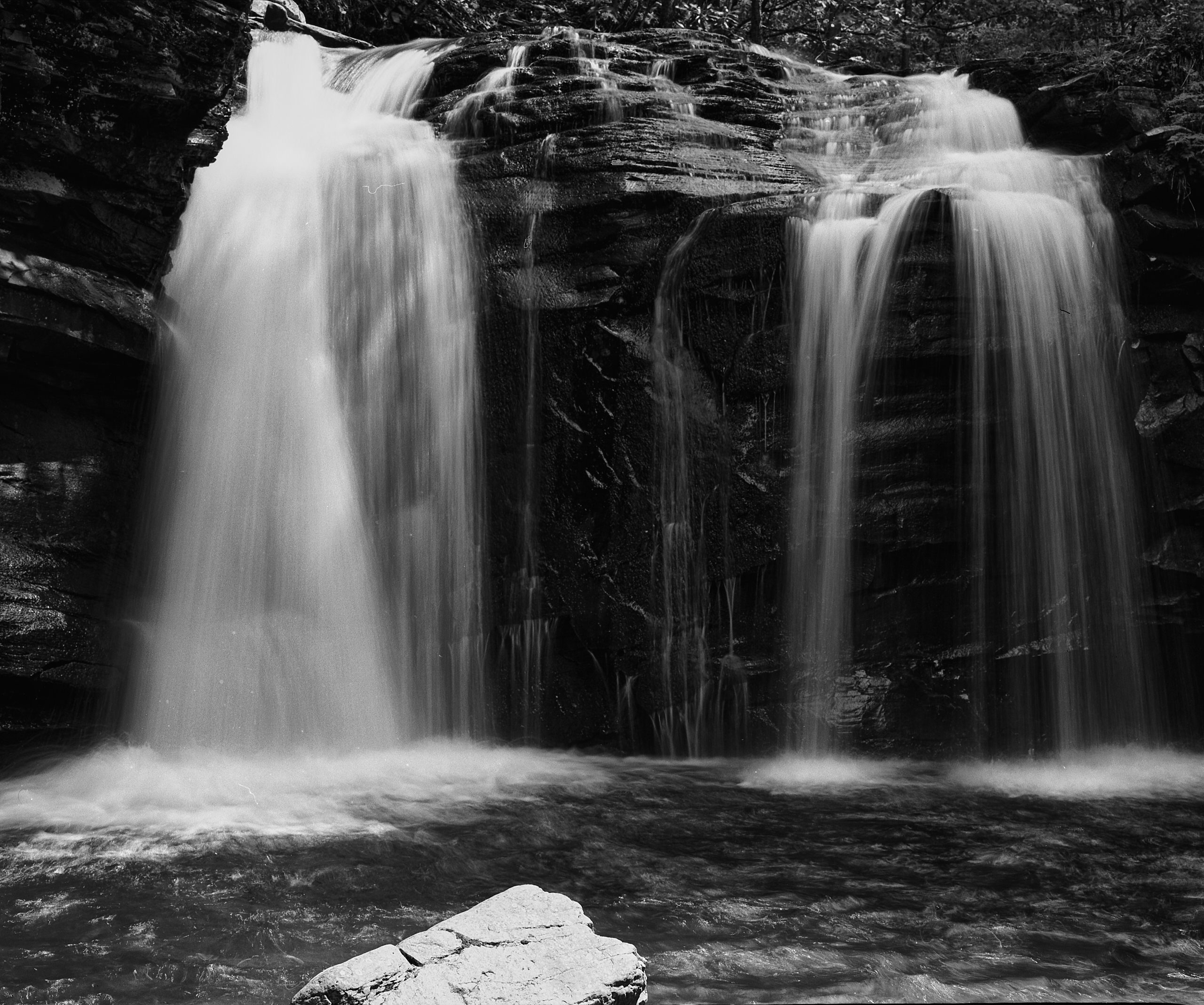 Another good B&W image. The rocks look like a coal face glinting in the sunlight. The falling water is made brighter by using the slow Shutter speed "silky-water" effect and that provides some good contrast to the dark rocks. Maybe the bright foreground rock could be made just a touch darker ?