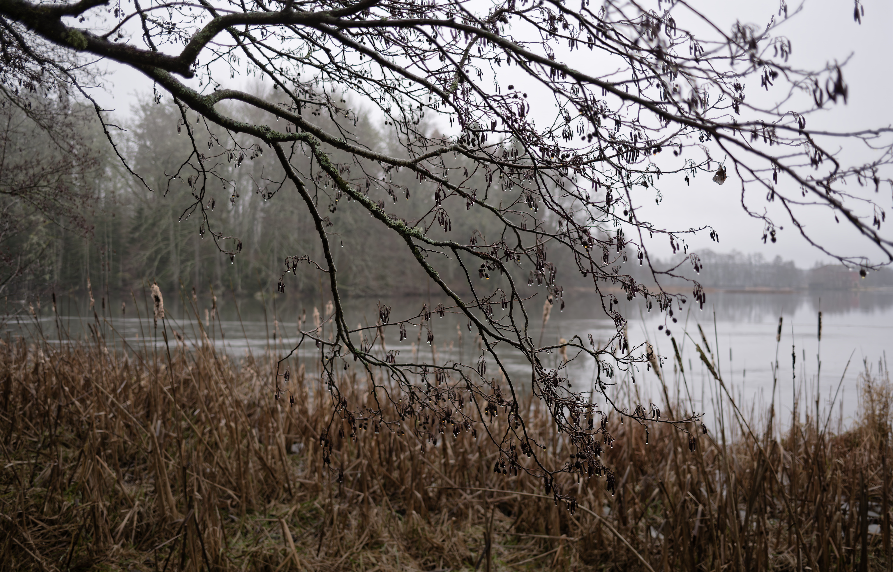 Nice veil of catkins bearing their raindrops. I agree with Fireplace about the brown grass - maybe crop a touch or desaturate the orange.