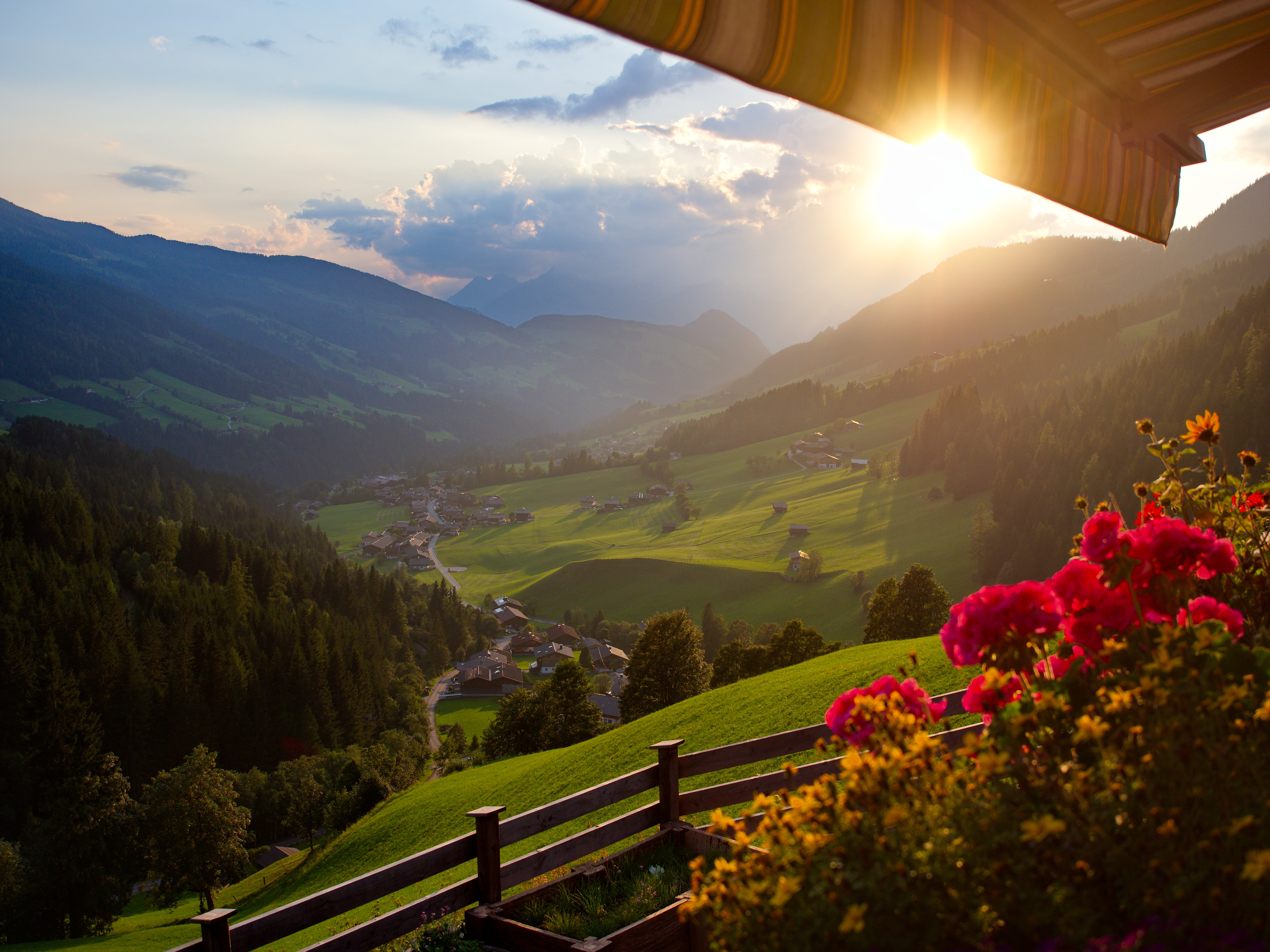 Nicely composed shot with the balcony flowers in the corner glowing bright red in the sun and contrasting with the view of green sunlit meadows in the valley.