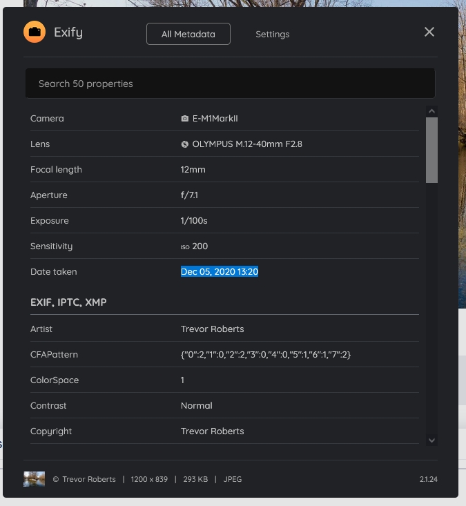 1.) the basic settings are evident below the image (i.e., camera model/make, ISO, focal length, SS, aperture) -- is there a way to see the EXIF/dates?