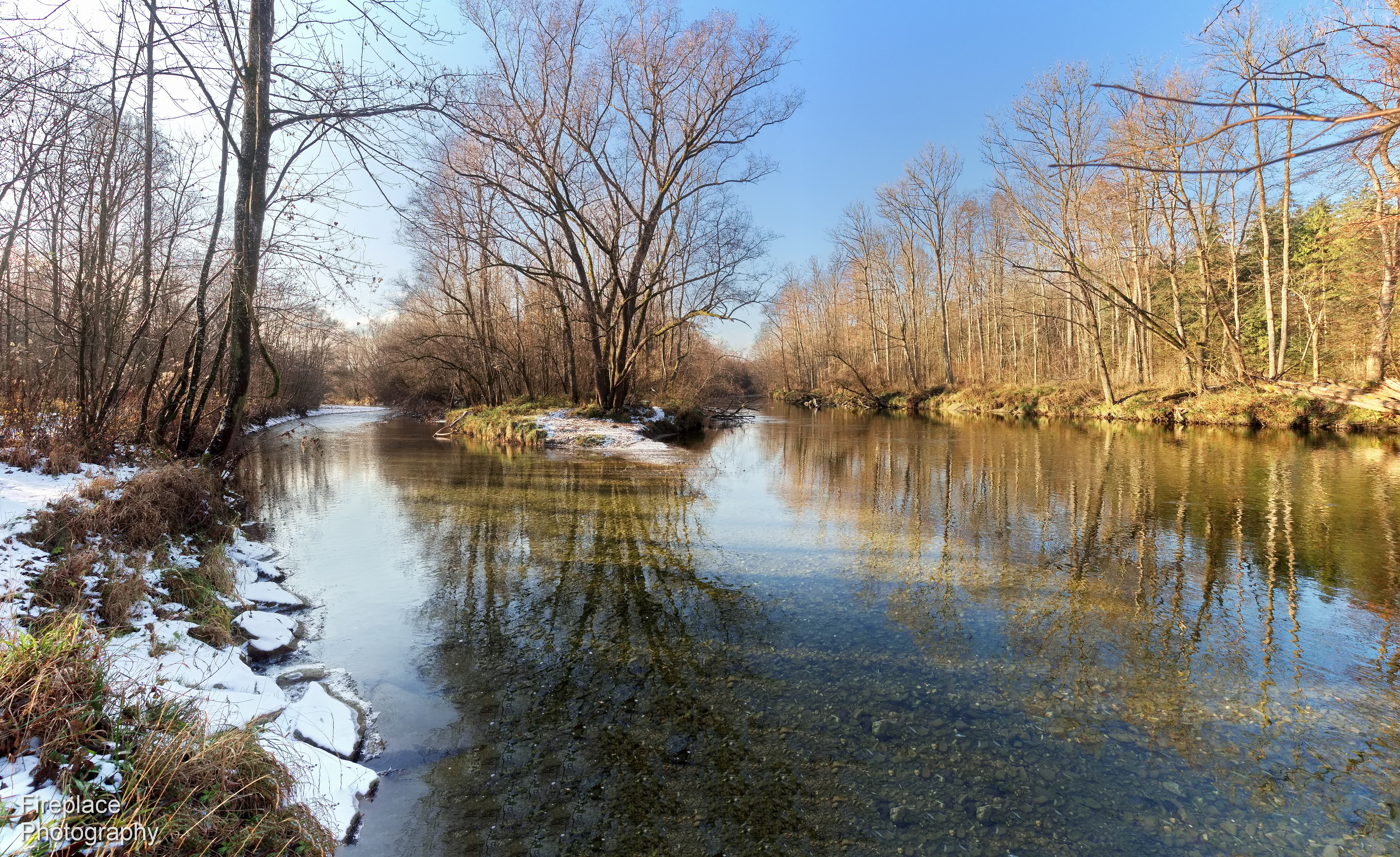 I wanted to put the viewer right into the scene almost into the water, and make the little frost covered spit, where the two rivers join, more prominent.