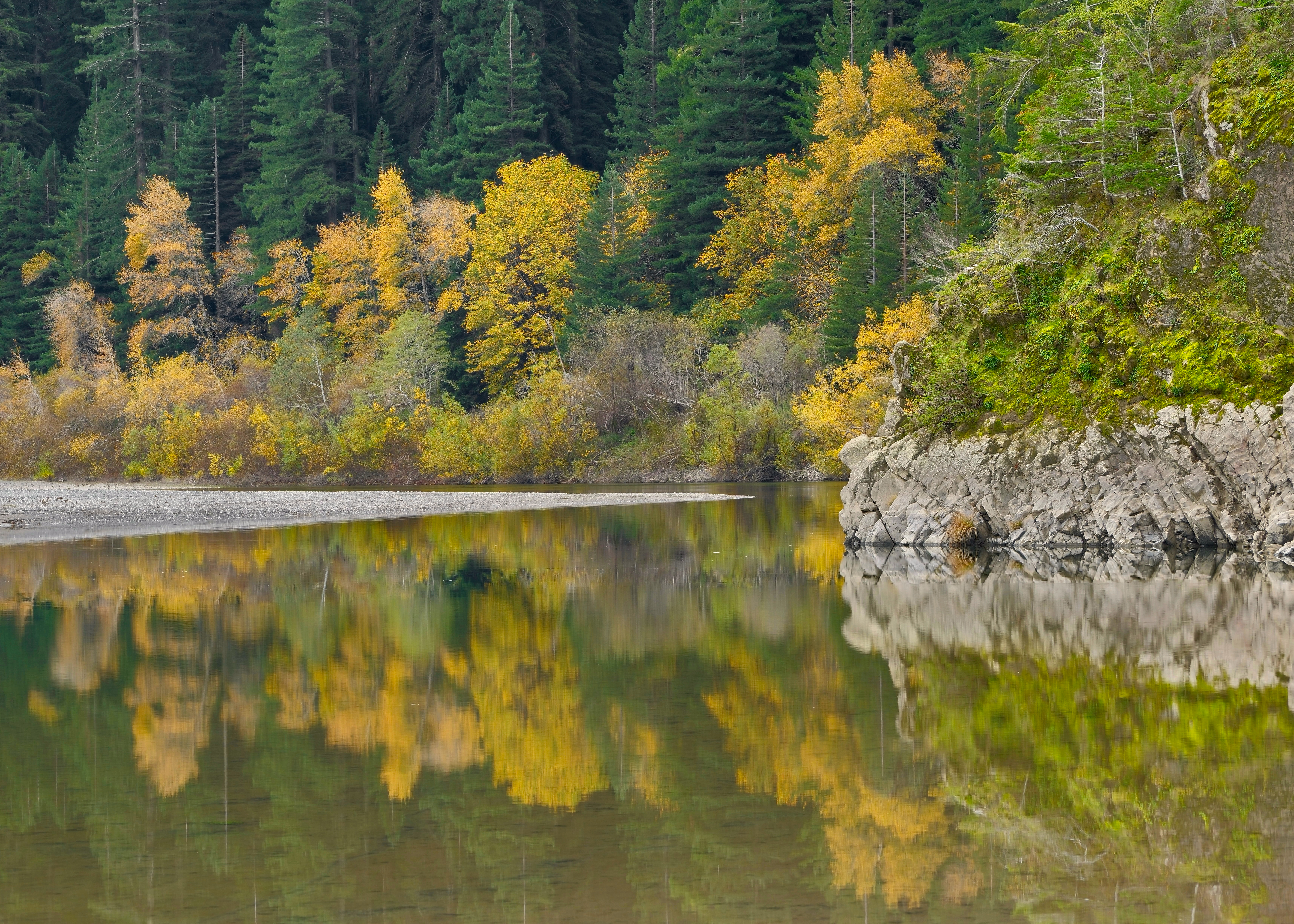 The first photo has a lovely mixture of yellows and greens, all reflected beautifully in the lake. The texture of the rock on the right is nice too.