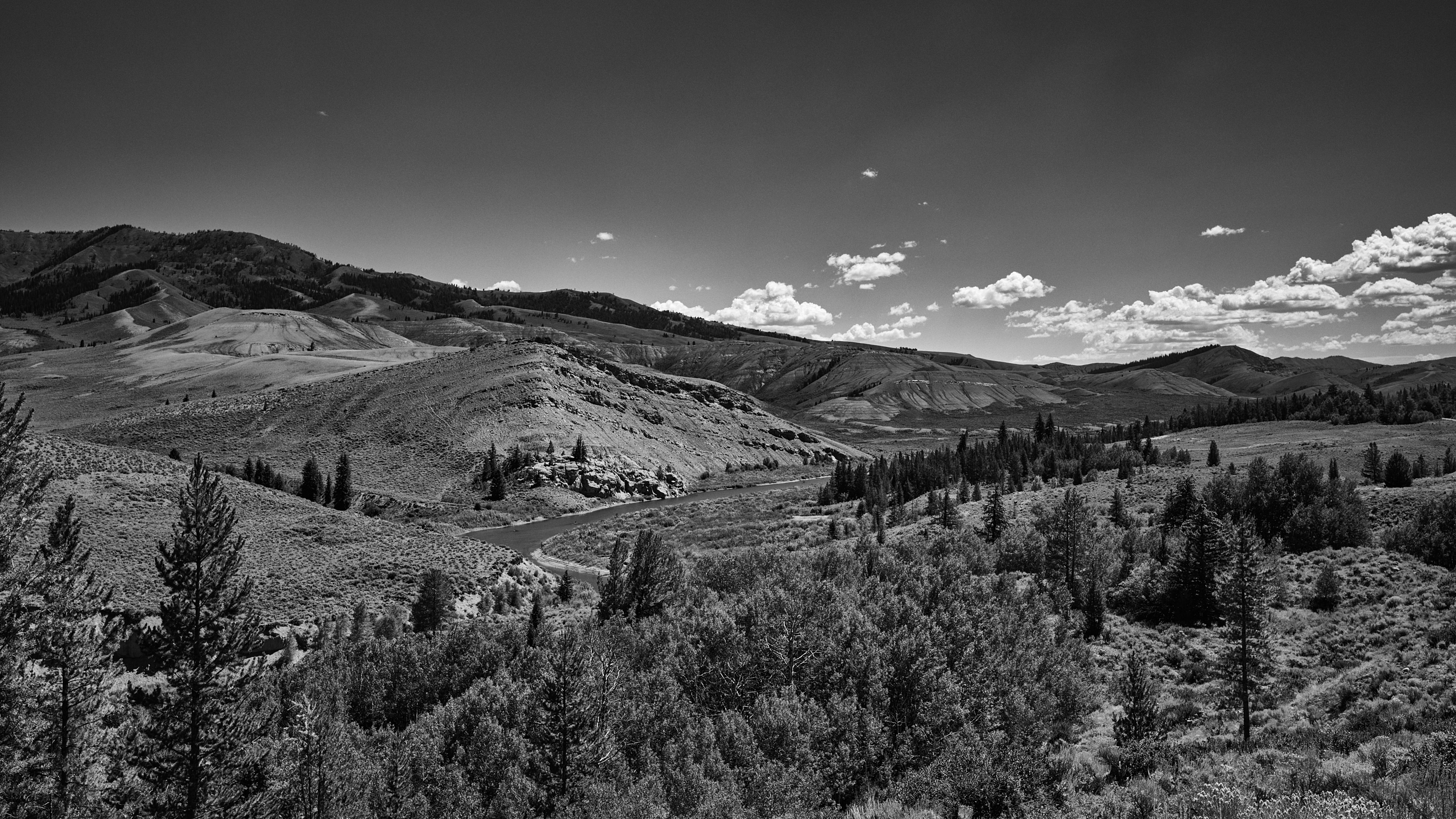 It's a classic "grand landscape" image, with a wide open valley and lots of nice textures to view. The lighting is good too, and as usual the tonality of your B&W shot is very well done. Those white clouds offer a nice contrast to rocks and forest.