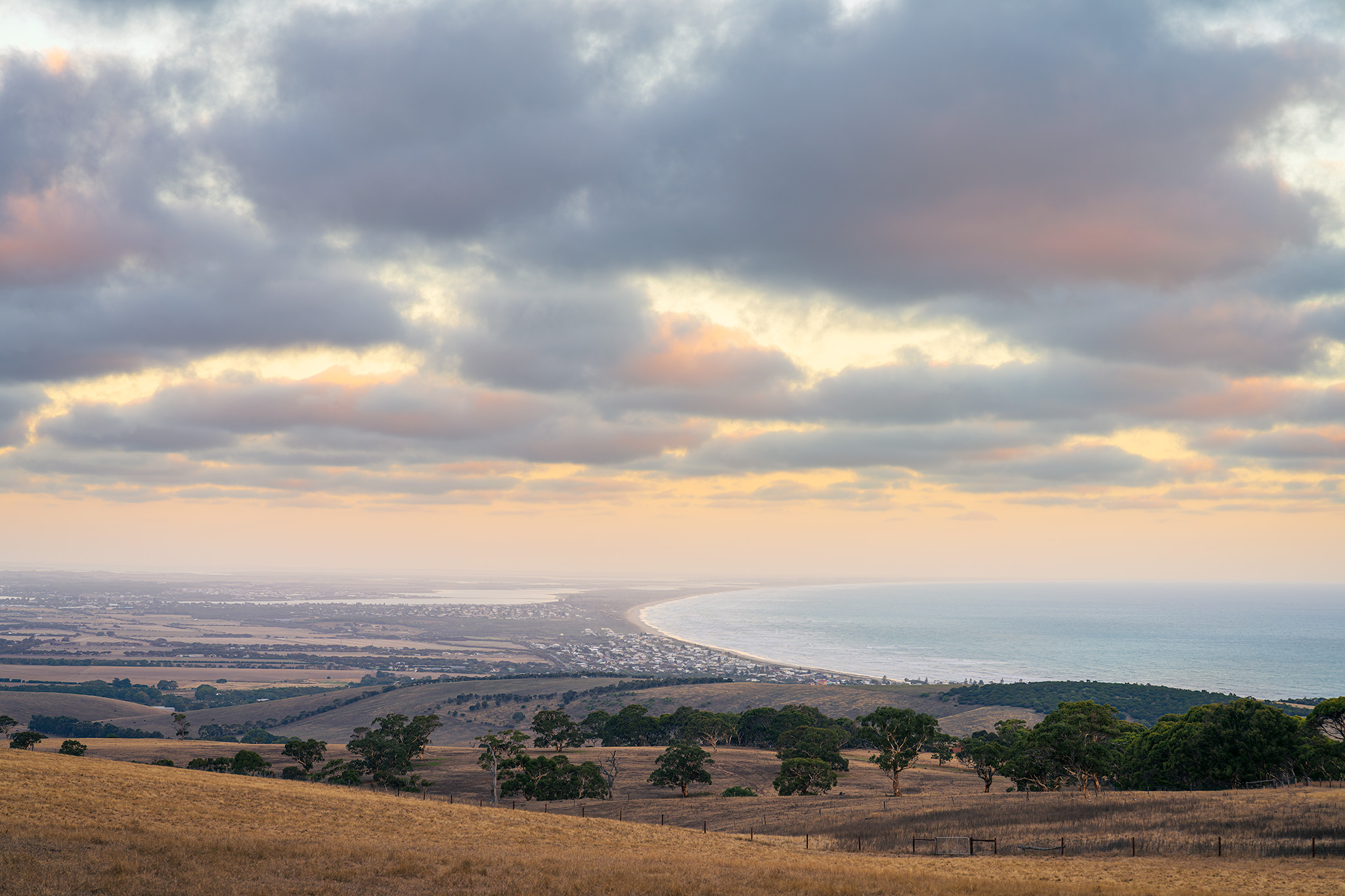 This is a view to the south east from a lookout on Crows Nest Road which runs up over the hill from the Victor Harbour Road down into Pt Elliot. The town in the middle distance is Middleton. The town surrounding the water is Goolwa. The water is the Murray River after it has flowed back out of Lake Alexandrina. If you look carefully there is a break through the dunes along the beach. This is the mouth of the Murray River. I took this just a couple of minutes before sunset.
