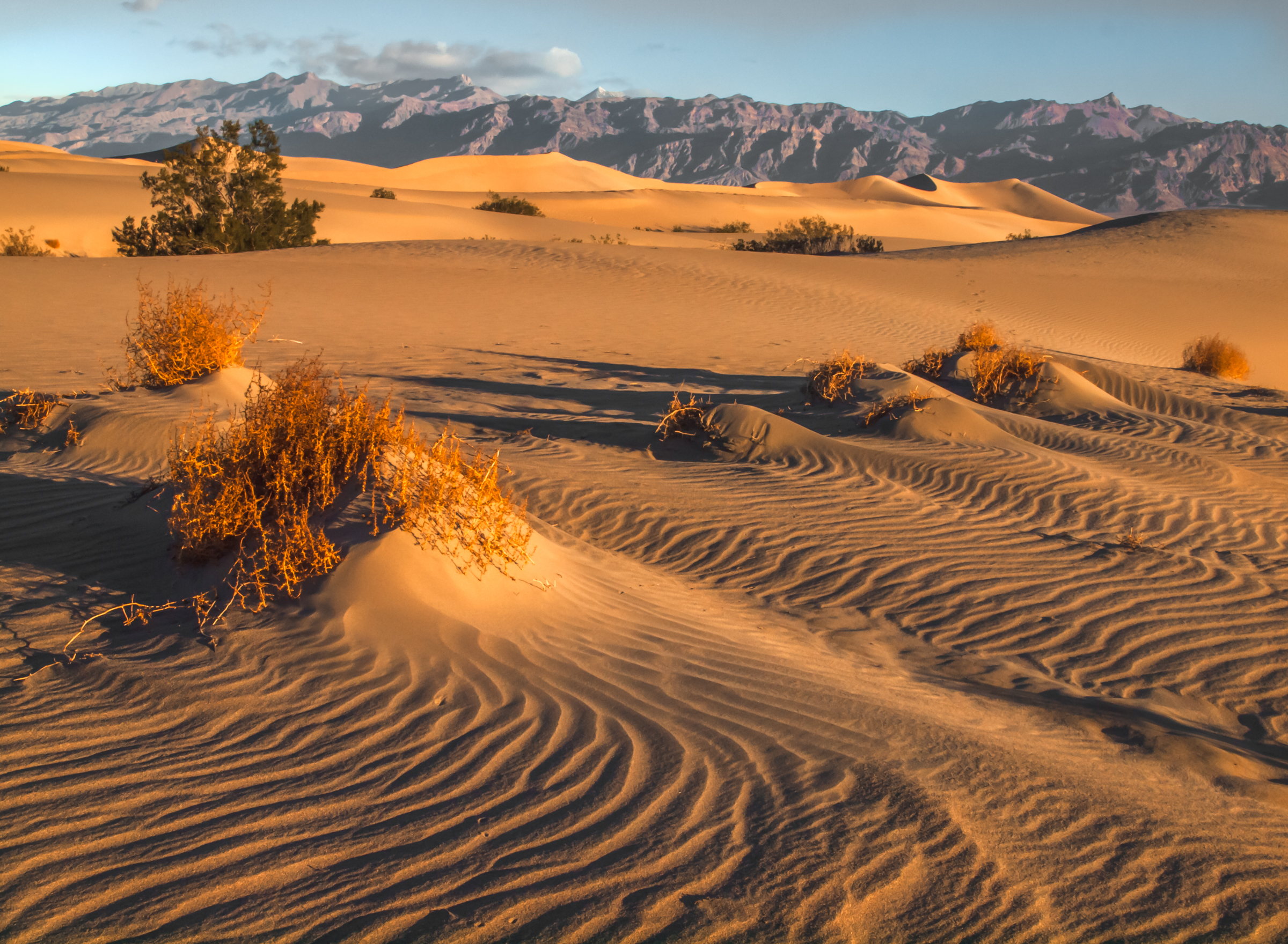 The dunes at Stovepipe Wells are amazing, especially in early morning light, but walking them will wear you out. I was there during a sandstorm, lucky to be in the lodge instead of camping in the adjacent campground. The campers had their nylon tents absolutely shredded by sand. The lodge took all the tentless folk in and let them sleep on the floor of the lobby and halls and even storage rooms. But the wind scoured the dunes of all footprints and created wonderful forms and striations, fun for the photographers among us.