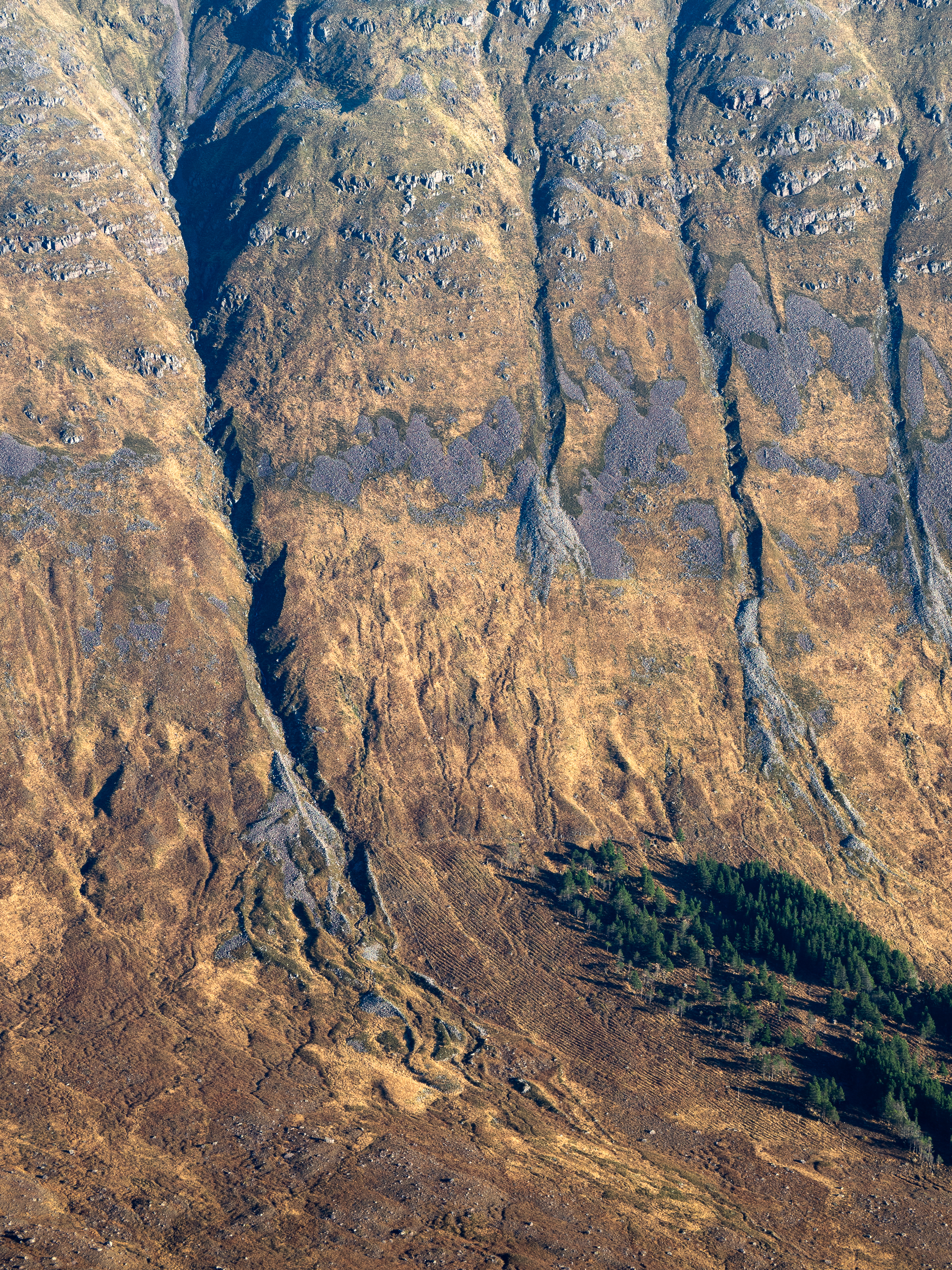 From Bealach Na Ba on the Applecross peninsula in NW Scotland. A chilly morning in the week before Christmas. The previous day had seen a terrific cloud inversion and i was hoping for more, but that day it was much weaker, though still revealing Skye's Cuillin mountains standing above the clouds. But it was this nearer hillside that really caught my eye.