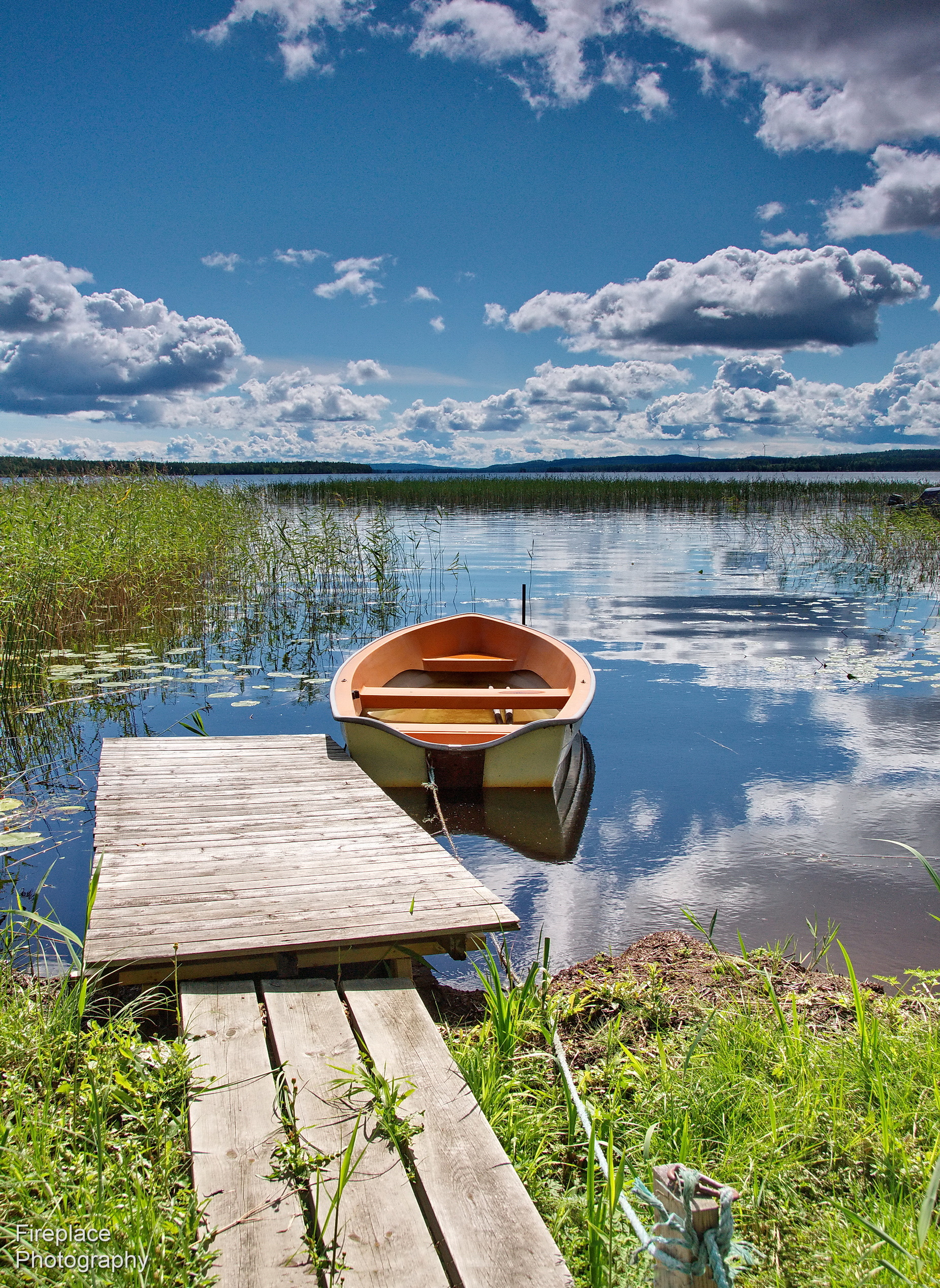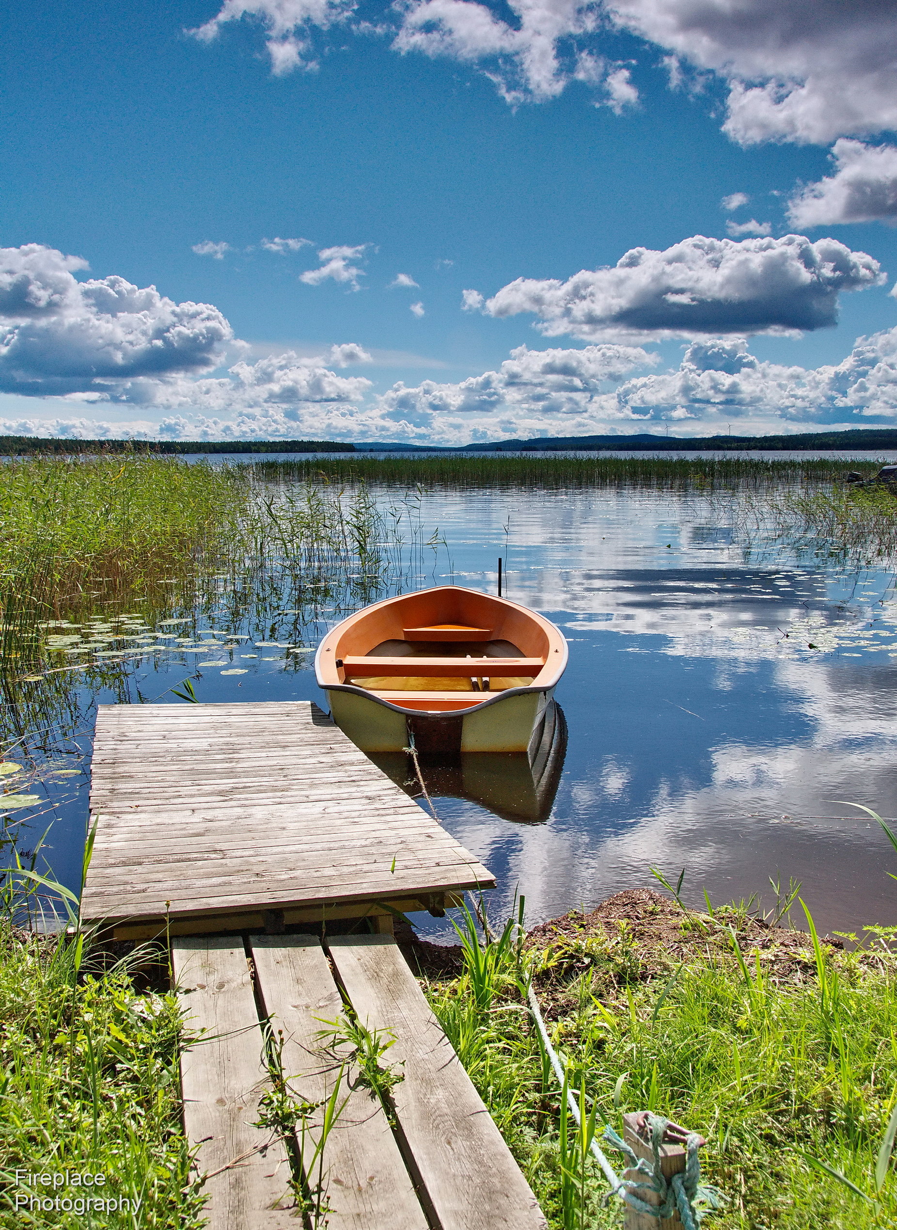 This photo was taken during a trip to Sweden. While driving, we noticed on the sat nav that a large lake was nearby, though it was hidden from view. We parked and walked over to the top of the ridge, discovering this beautiful lake. It would have been wonderful to untie the boat, stroll down the small pier, jump in, and explore the water, but unfortunately...