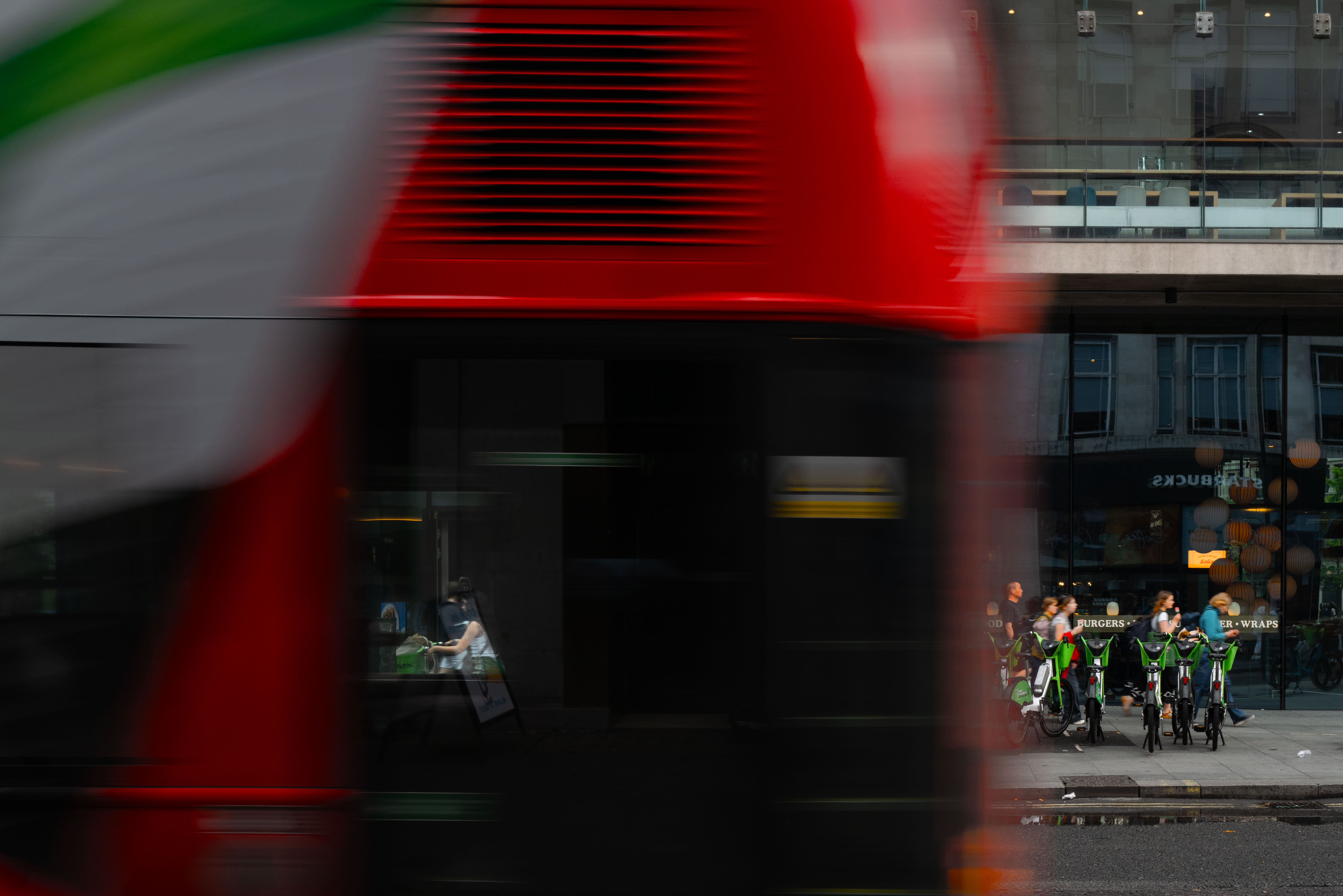 It's not just the color, I think the scene has a good dynamism, with the movement of the bus, cyclist and pedestrian in different directions. And I also like how the bus and its reflection confine the scene in a certain way...
