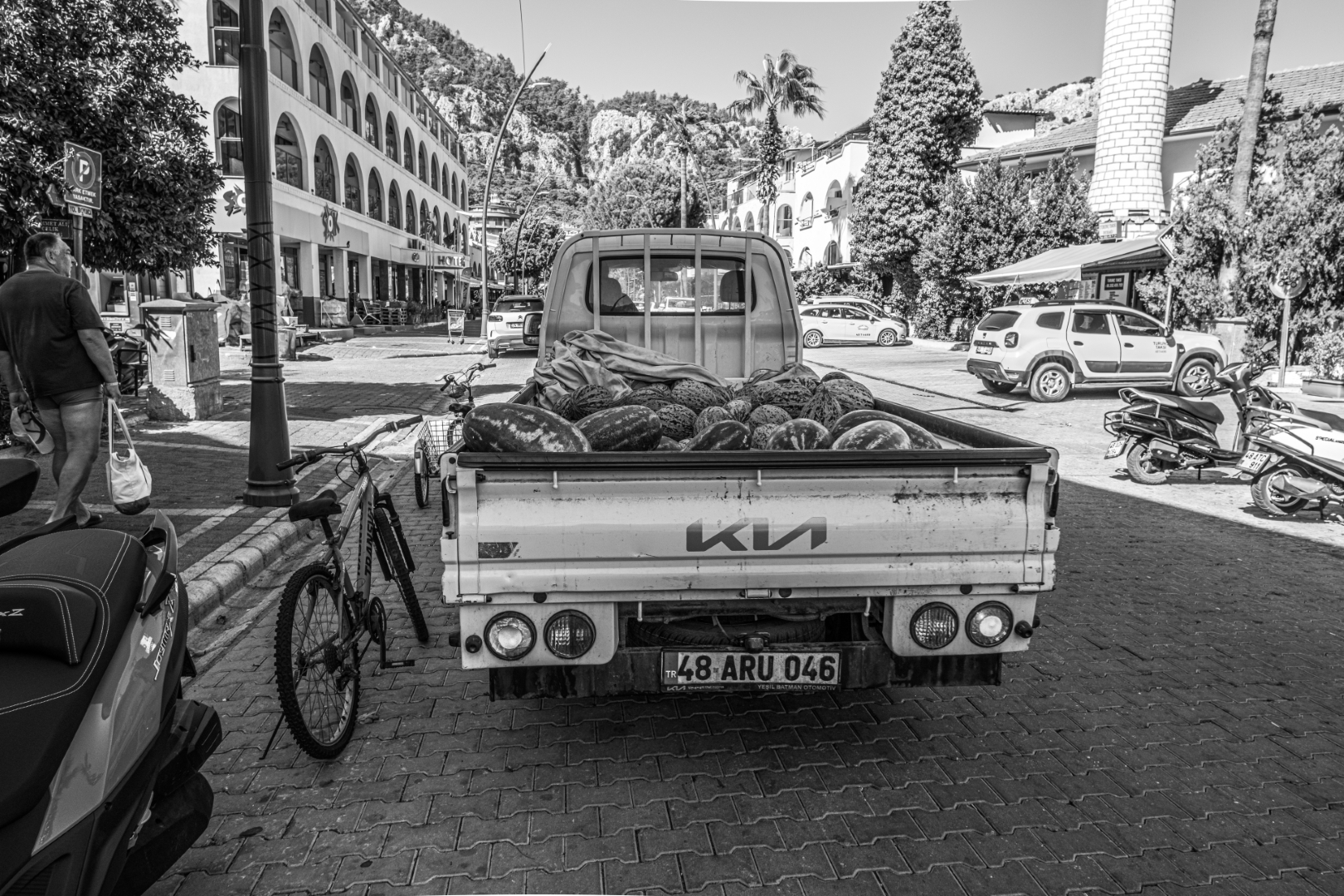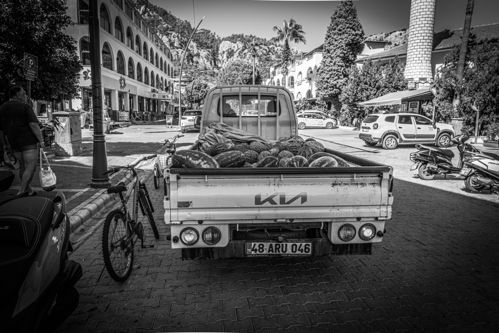 I took this image of a streetseller's truck filled with melons. My 10 year old grandson suggested making it B&W and I vignetted it to make it look older. What do you think?