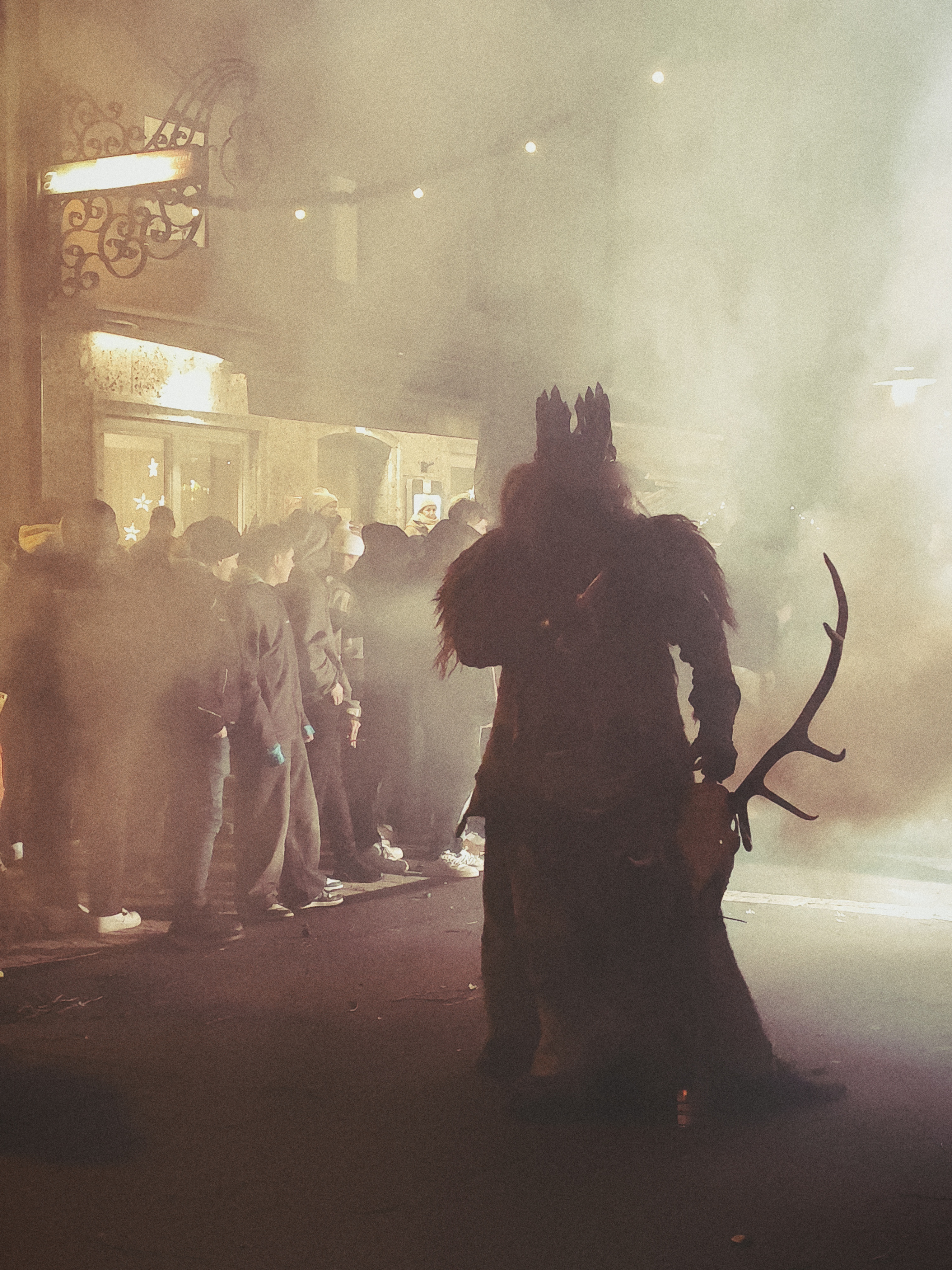 This shot was taken at a "Perchtenlauf" in a town in Salzburg (state) in Austria. This guy and his costume had the air of a monster king. He slowly approached through the mounting fog, his crown and quiet menace setting him apart from the other perchten.