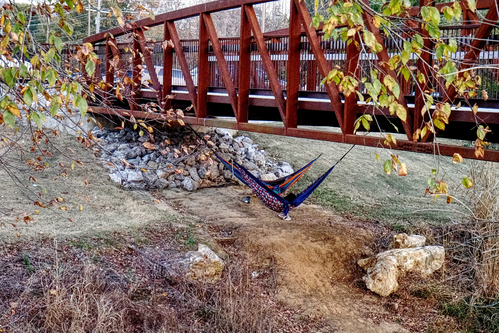A perplexing question ..... My original thought was homeless as these hammock have been here for a couple weeks that I've noticed but never looked closely... We've had a hammock here another year but using the usual trees for support ...However, looking closely at these they don't look like something a homeless person might bring to the park and for the first time someone is in them and there is no baggage that a homeless person normally has with him but then not sure why someone would go to this much trouble just to chill out! ..... I'll just leave it to you to make up the story ...