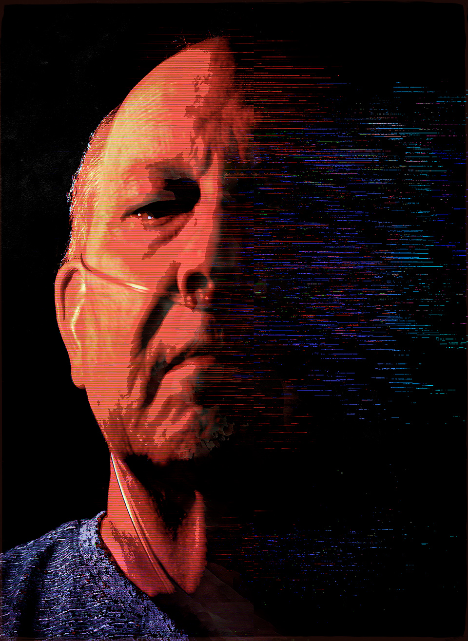 The image is a glitch processed self portrait composited over itself a couple of times using blend modes and masking. Everything in the image except the border originated as a photograph. It can be very hard to tell because AI is quite good these days.