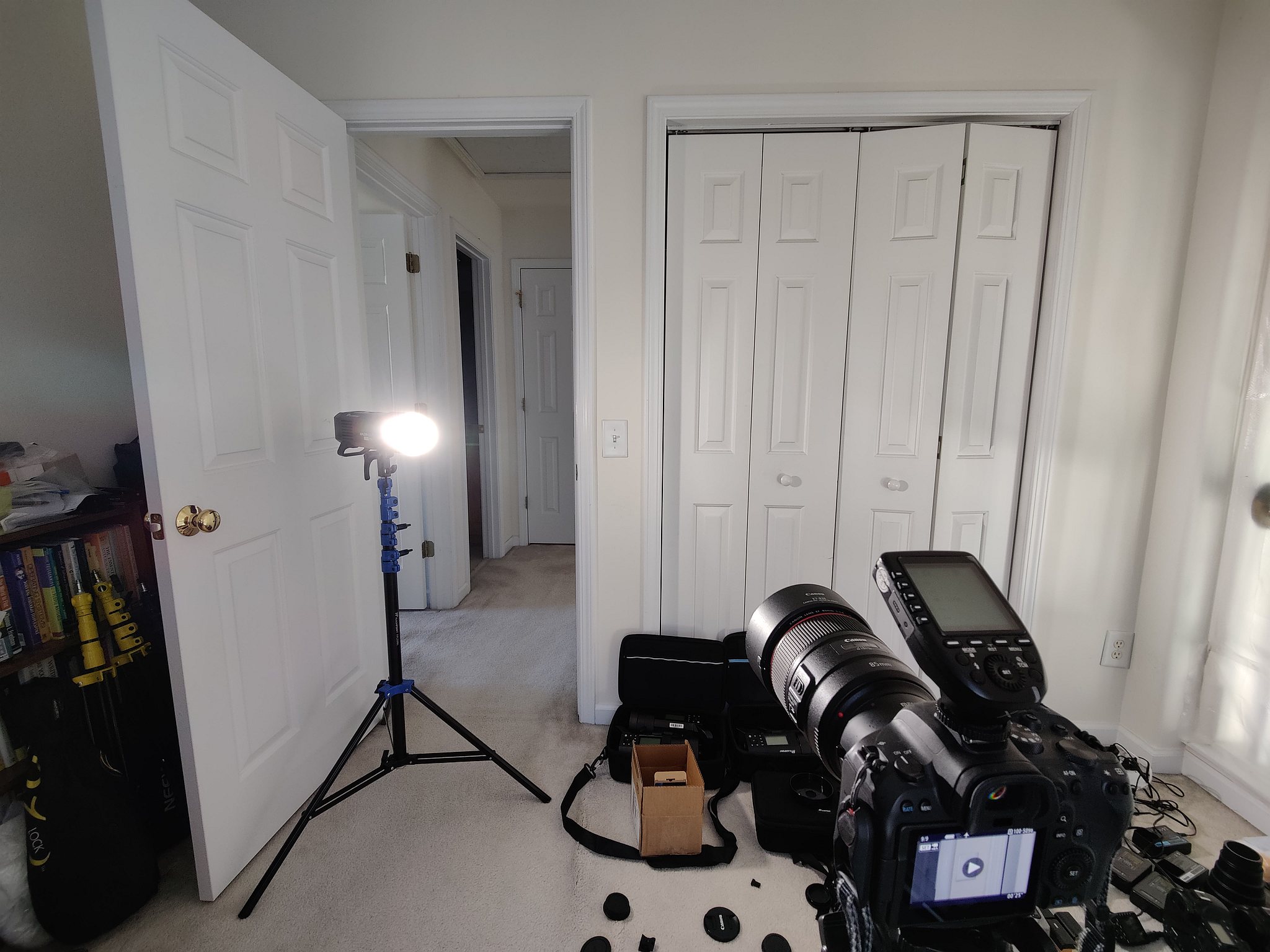 Below is what the test setup looks like. The Godox AD400Pro LED modelling lamp on a stand is used to simulate a bright light for the sake of reproducibility. For video using the R6 on a tripod and Canon EF 85mm/1.4 IS with lens hood.