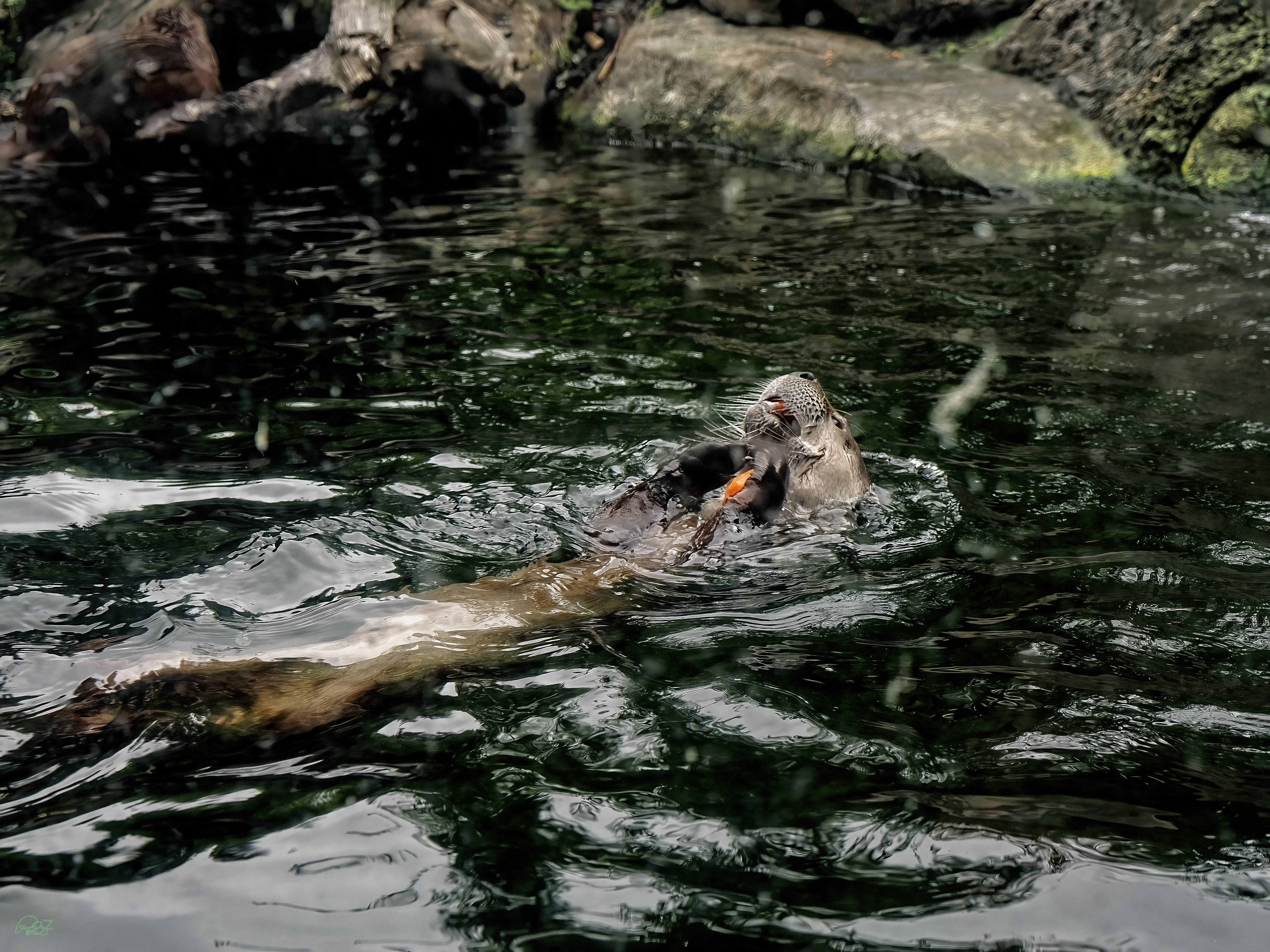 This otter was too busy eating lunch to join in.