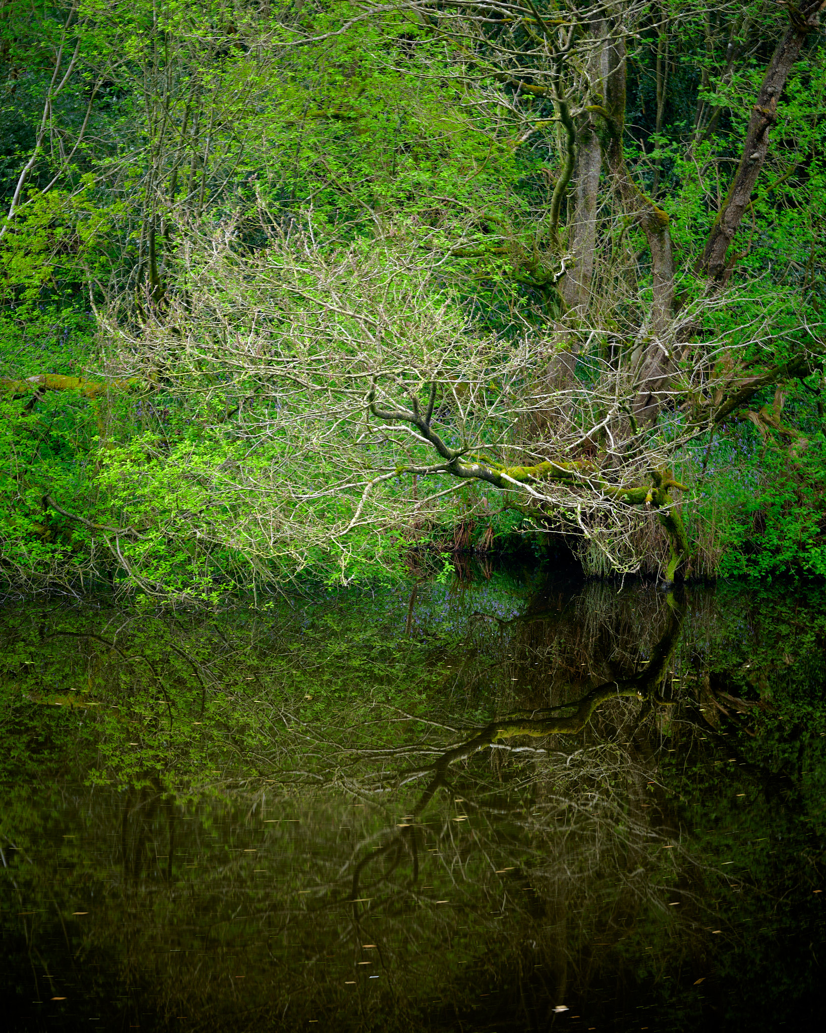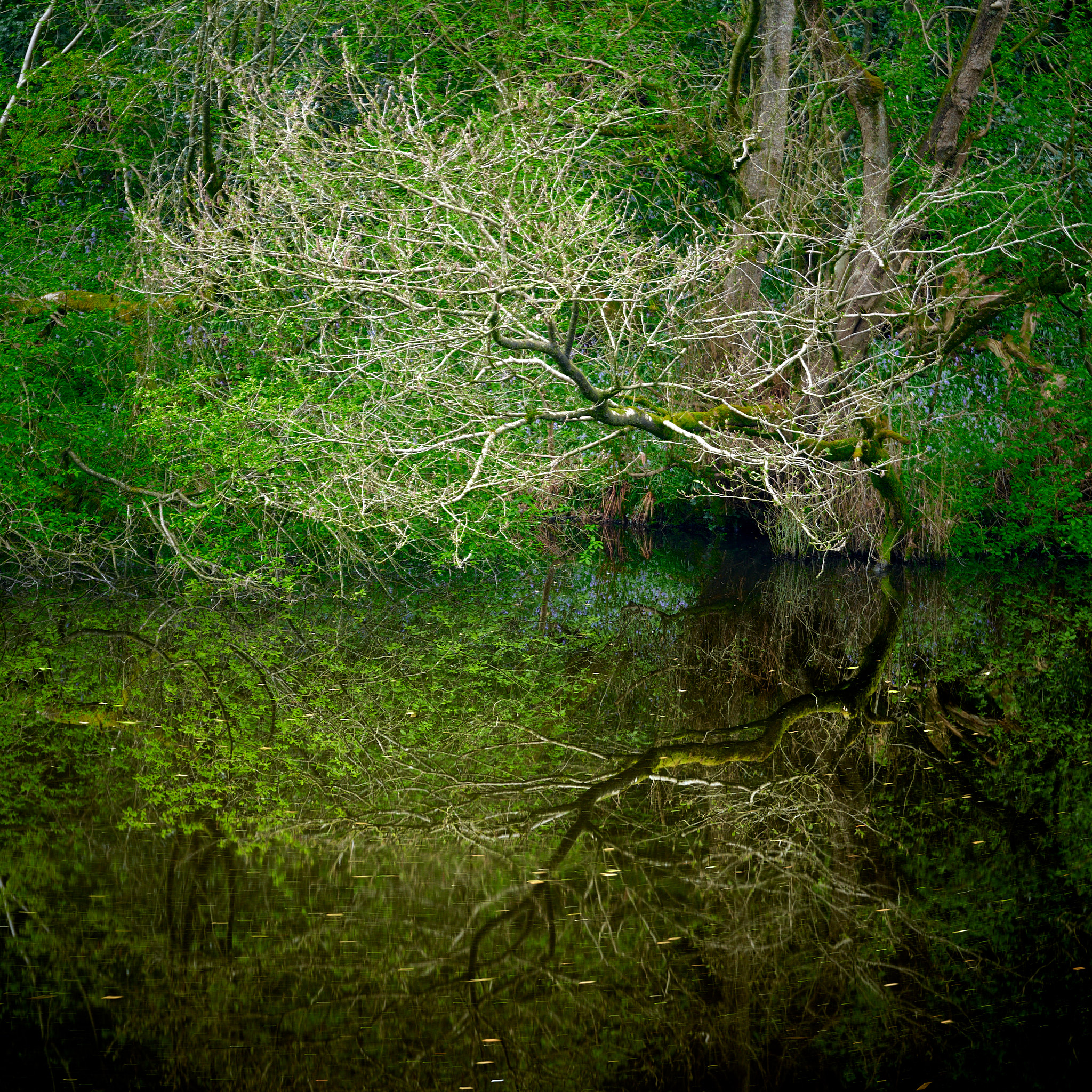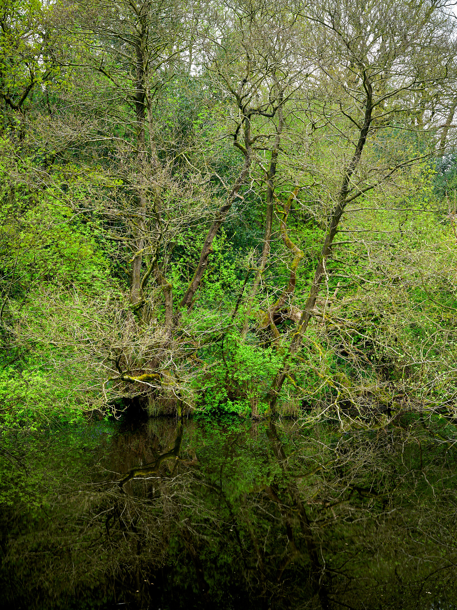 I did have a dabble with cropping to just the reflection and flipping it vertically to make it more surreal. It sort of works, but there's no clear point of focus. I do like how it's emphasised the bluebells lurking by the shore a bit.