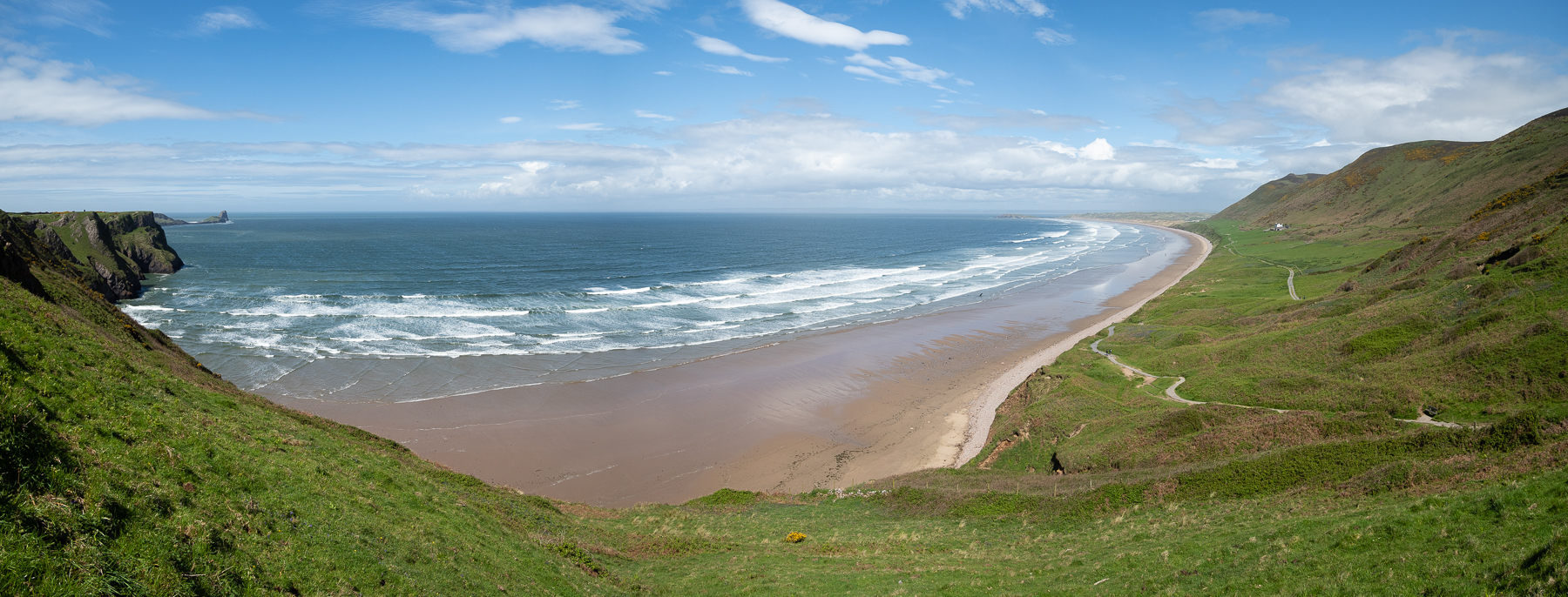 Rhossili bay. We had planned to walk across the tidal causway to Worms Head, but the wind was making conditions unpleasant so we gave up on that and just strolled around the clifftops.