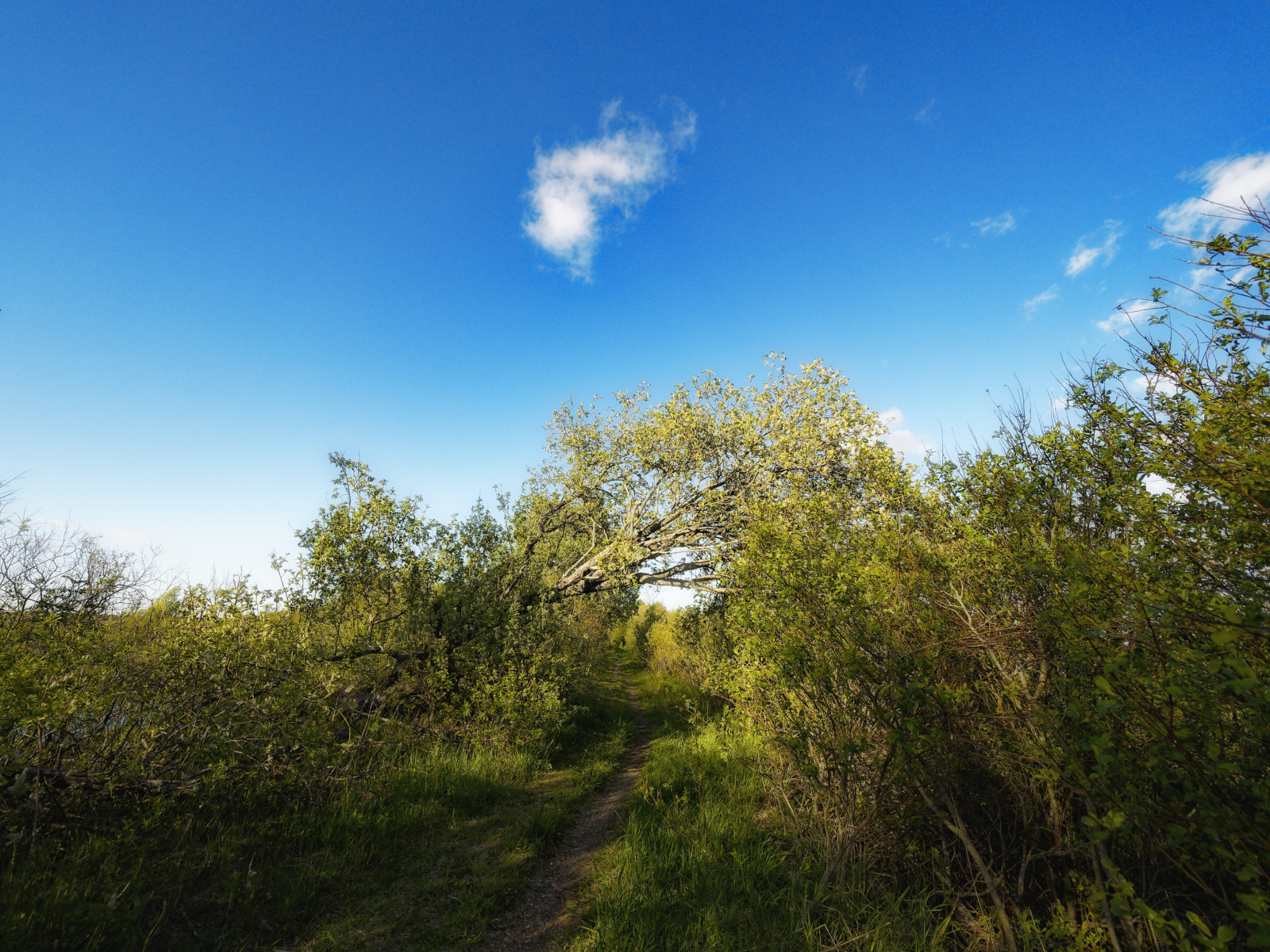 Narrow road through low and watery land near lake, lake further bit on left.