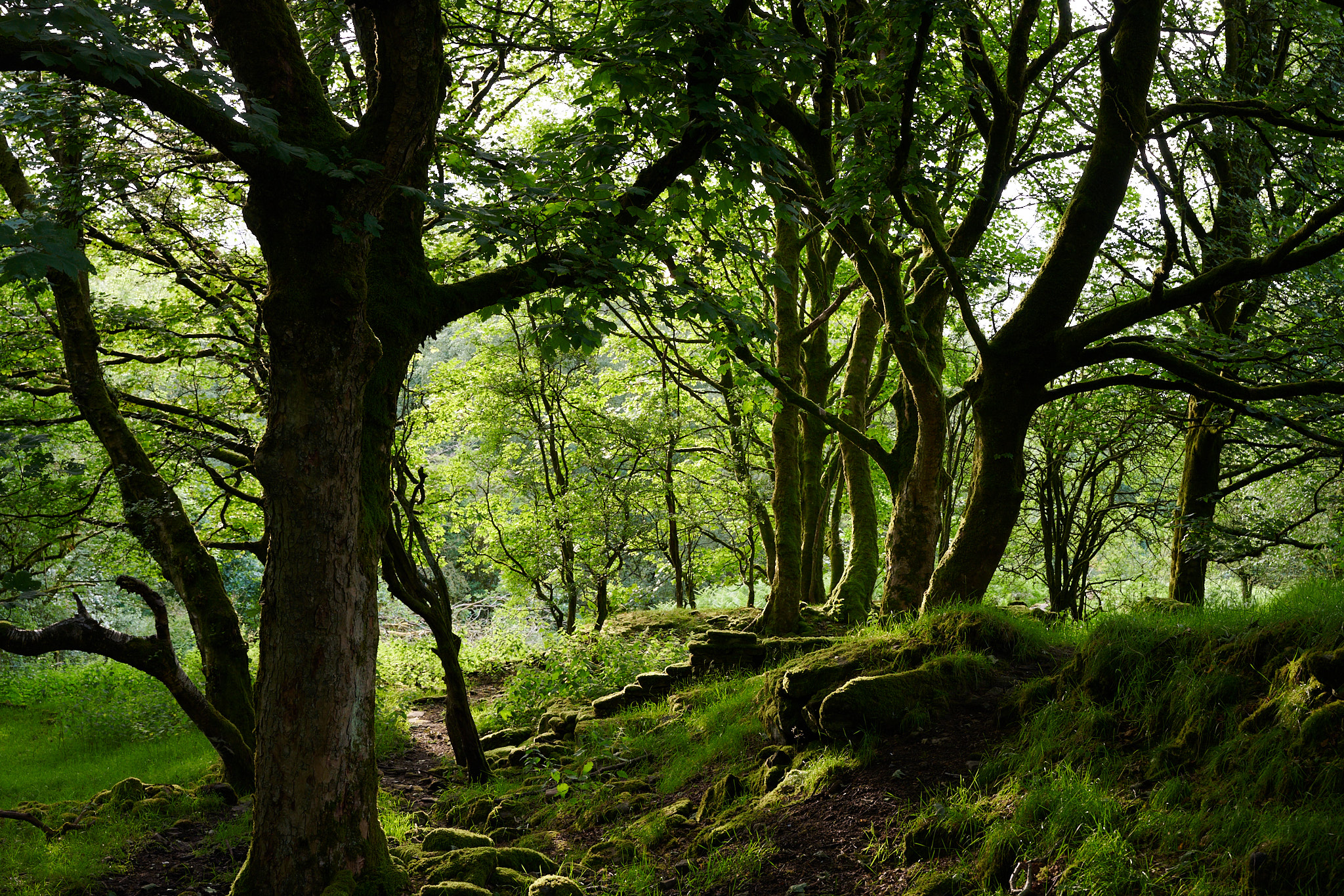 As I was distracted with the trees overhead, I missed the path leading off Well Lane towards Cocker's Folly and instead ended up climbing a fair bit higher onto the moors than I'd intended. Not wishing to just retrace my steps back down the lane, I instead took the next stile to my left and followed a path running back downhill through the wooded glade that runs along the Northern edge of Well Lane, this would eventually connect with the path I'd originally intended to take. As I followed the path, it took me past a set of mossy covered ruins hidden amongst the trees. I've no idea what these once were, but they are shown as unlabelled buildings on the 1888 OS map, so they've been there for quite some time.