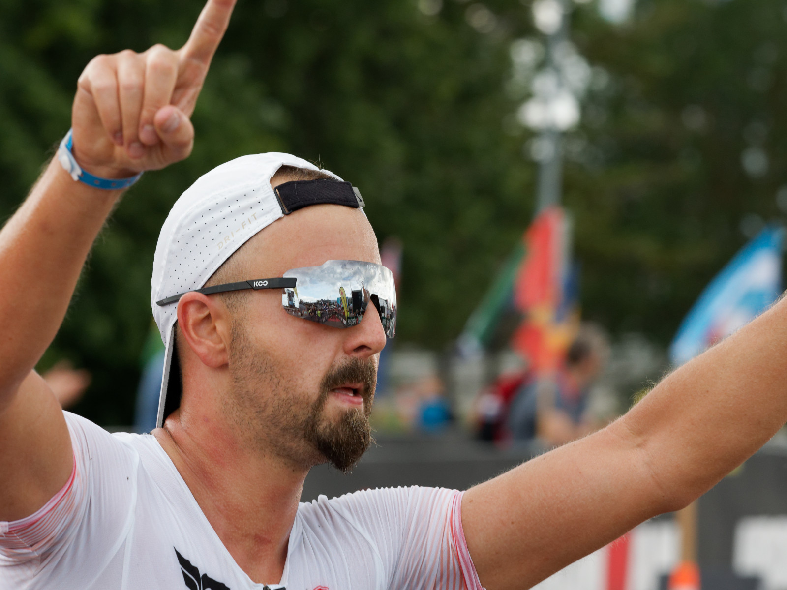Finish line red carpet can be seen from reflection. 226 km is behind.