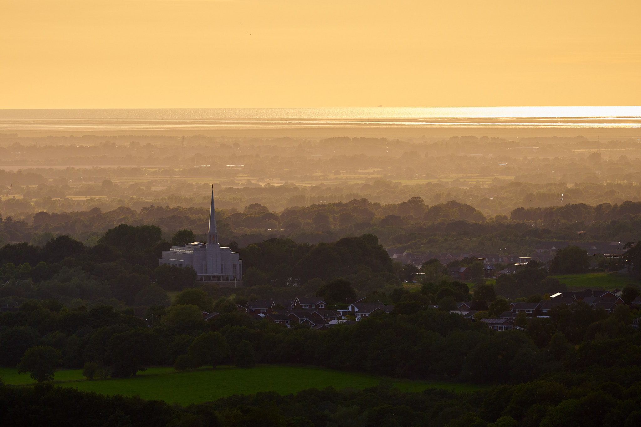 I rounded the top of Black Coppice and set out down the path above Black Brook. The path gradually descends to a crossing point further up the stream where you can cross to the Heapey Moor side, but as I headed for that point I regularly stopped to look back downstream and spotted this composition of the Mormon Temple at Chorley North.