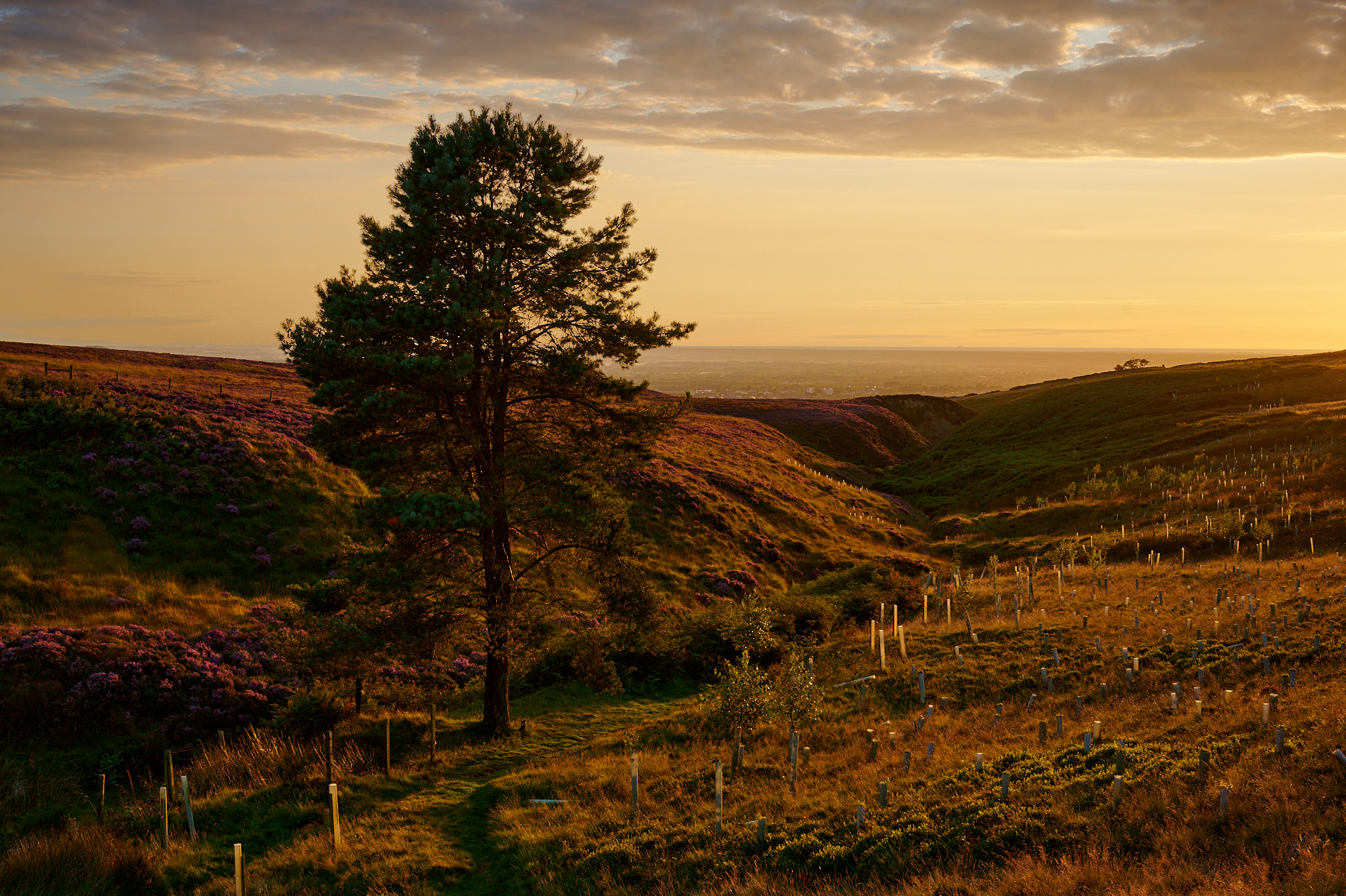 Eventually the high ground on the Northern bank of the stream falls away and reveals Heapey Moor. Here, I've come a little way above the stream and am again looking downstream. Once again, that the Coppice Stile tree on the distant ridge. I'm not a big fan of the way these sapling protectors look, but backlit they become a bit more interesting.