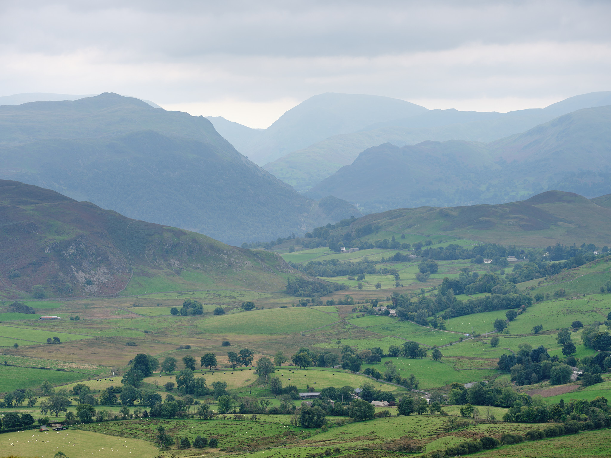 Well, it would be rude not to include a shot of the mountains. This is looking more or less due South from Great Mell Fell. The big lump on the left is Place Fell and the distant one poking into the clouds is Red Screes.