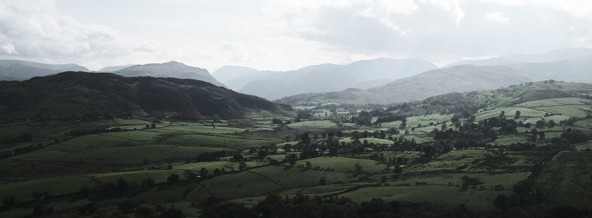 After fighting my way through the jungle ferns, I eventually reached the relative safety of the main path and continued my slog up towards the summit. I stopped a couple of times and turned to enjoy the view. This is looking more or less due South towards Patterdale, with Ullswater lurking unseen from here at the bottom of those distance peaks. This is one of those shots that I felt looked better with the Eterna Bleach Bypass film simulation, largely because the hazy colours were muddy and the contrast was weak, so although this film sim looks kind of unnatural, I think it's more pleasing in this instance than the standard Provia sim that Fuji cameras use as by default.