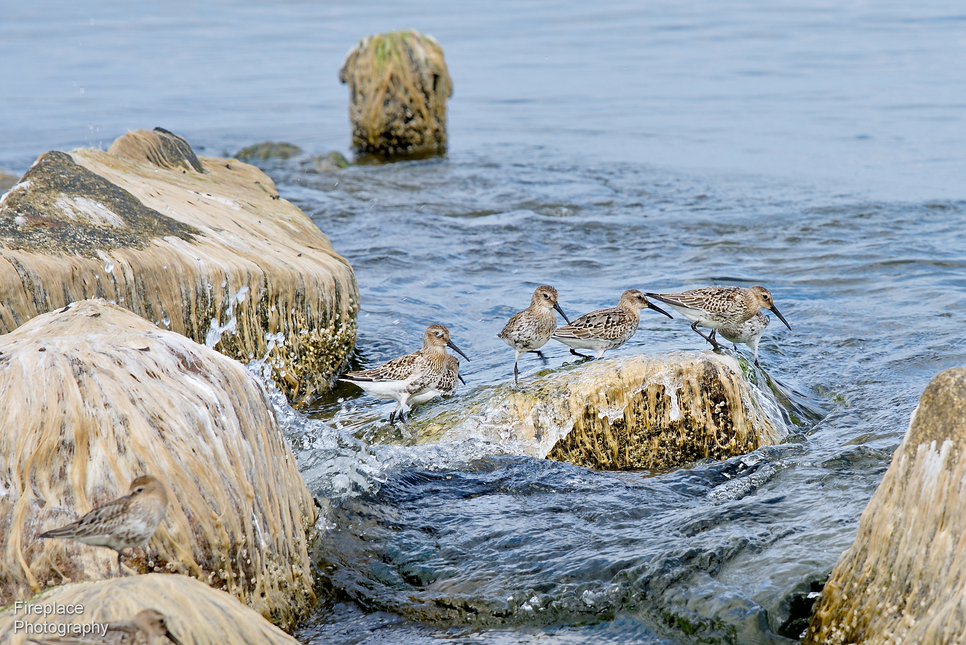 A little fling of sandpipers running back and forth on the sand and jumping over on the stones when the waves come