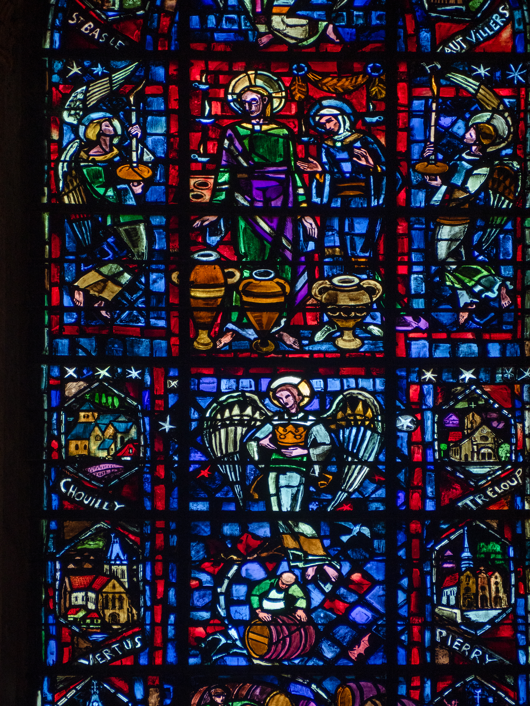 Our autumnal peregrinations took us via Reims last night. Everyone has to go to the cathedral. It's huge, and impressive in its way, but to me seemed dark and opressive. But the stained glass is amazing, much of it 13th century.