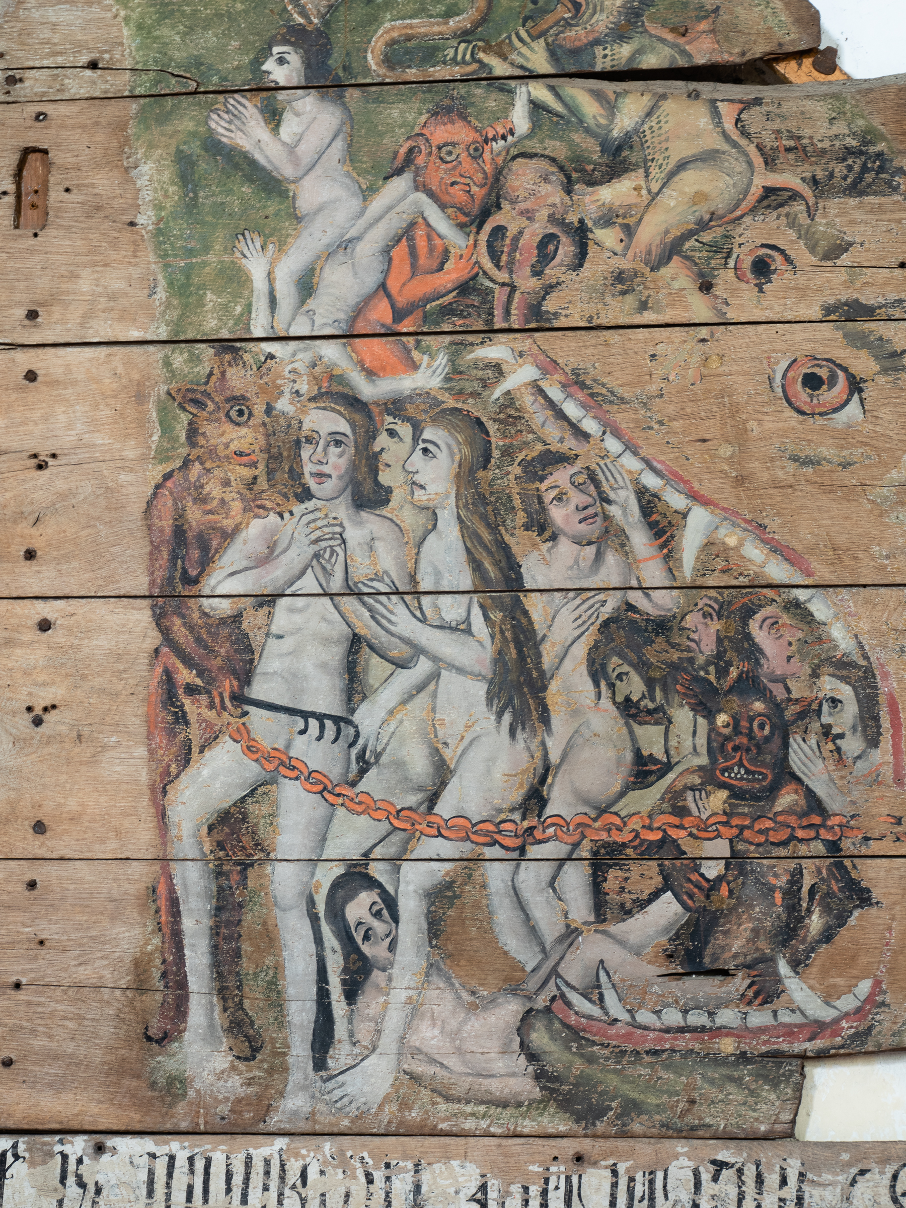 The carvings are quite protected, inside the porch. Reminded me of some frescos in Albi cathedral, and of a much less known panel in Wenhaston church, Suffolk;