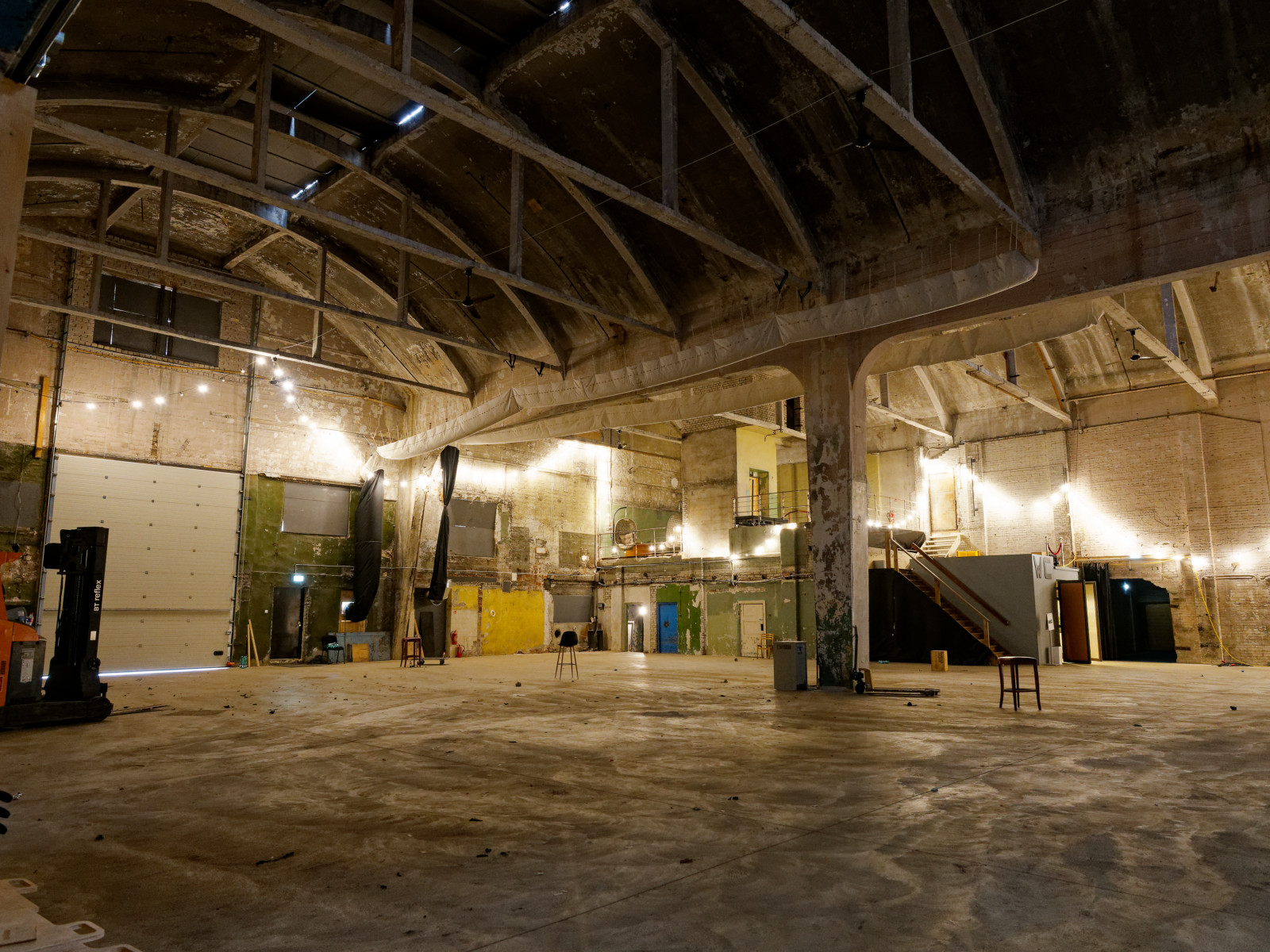 Inside factory hangars. In one hangar was performance hall built with seats and stage, others are mostly empty but can be repurposed, this year's Simpel Session (skateboard and bmx competition) was organized in one of such hangars.