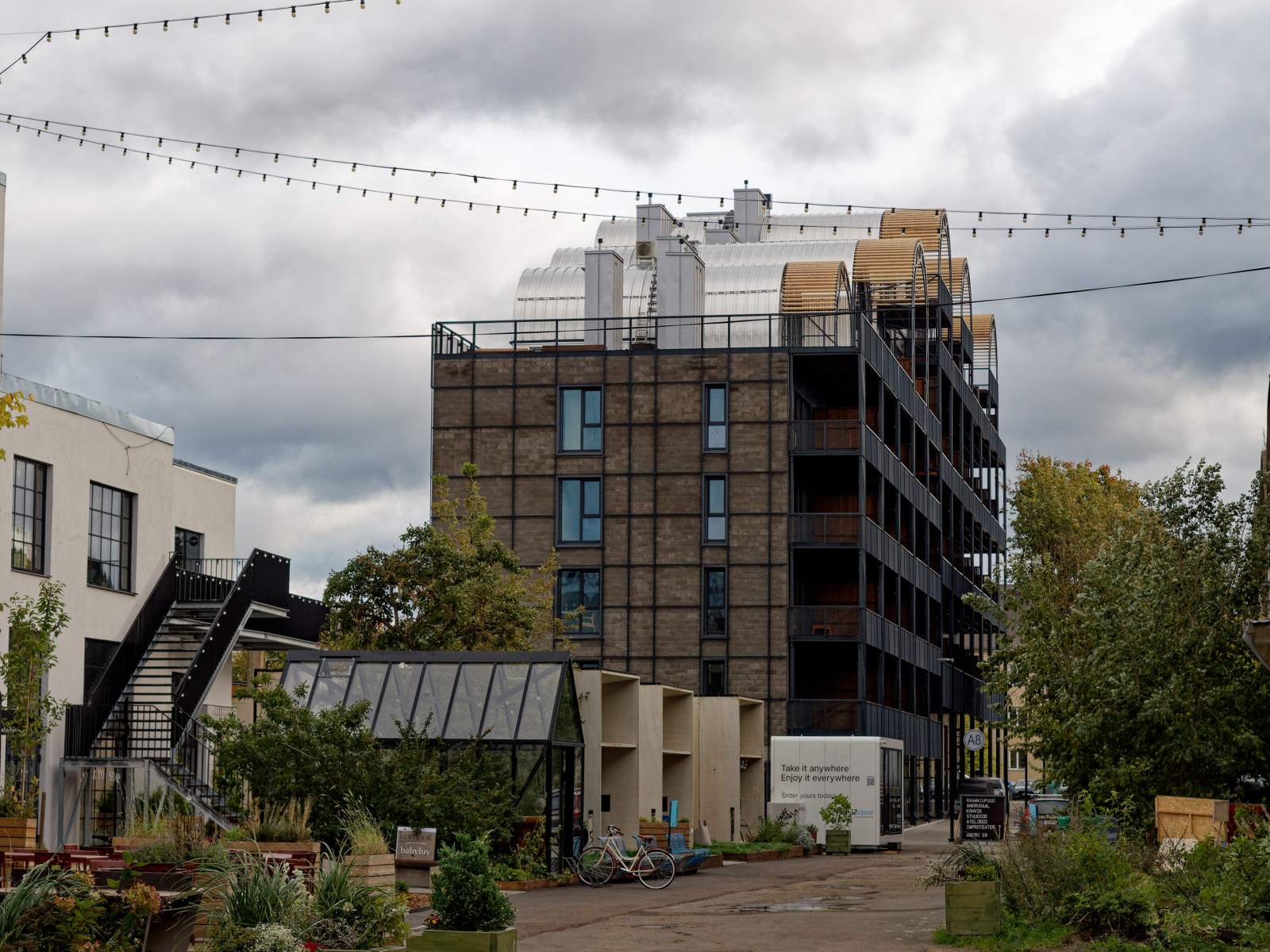 On yard you can see small modular offices, on background new building which roof construction resembles factory building roofs across.