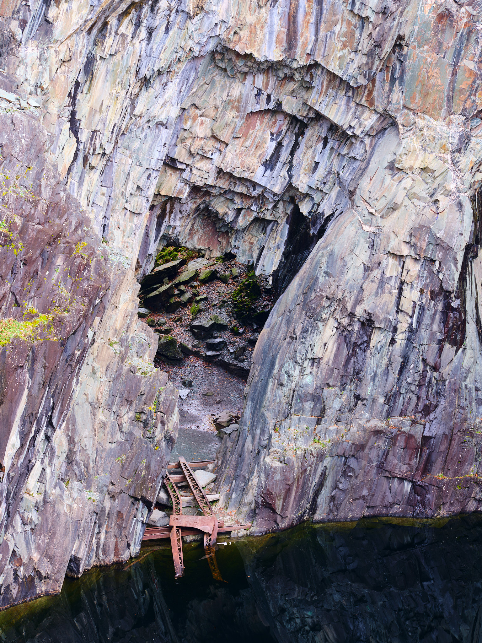 This is a close up of the cave that's more or less central in the previous image, giving a better look of the framework bending off into the water that once supported some substantial piece of mining equipment. You can also see light spilling in from the opening at the back of the cave.