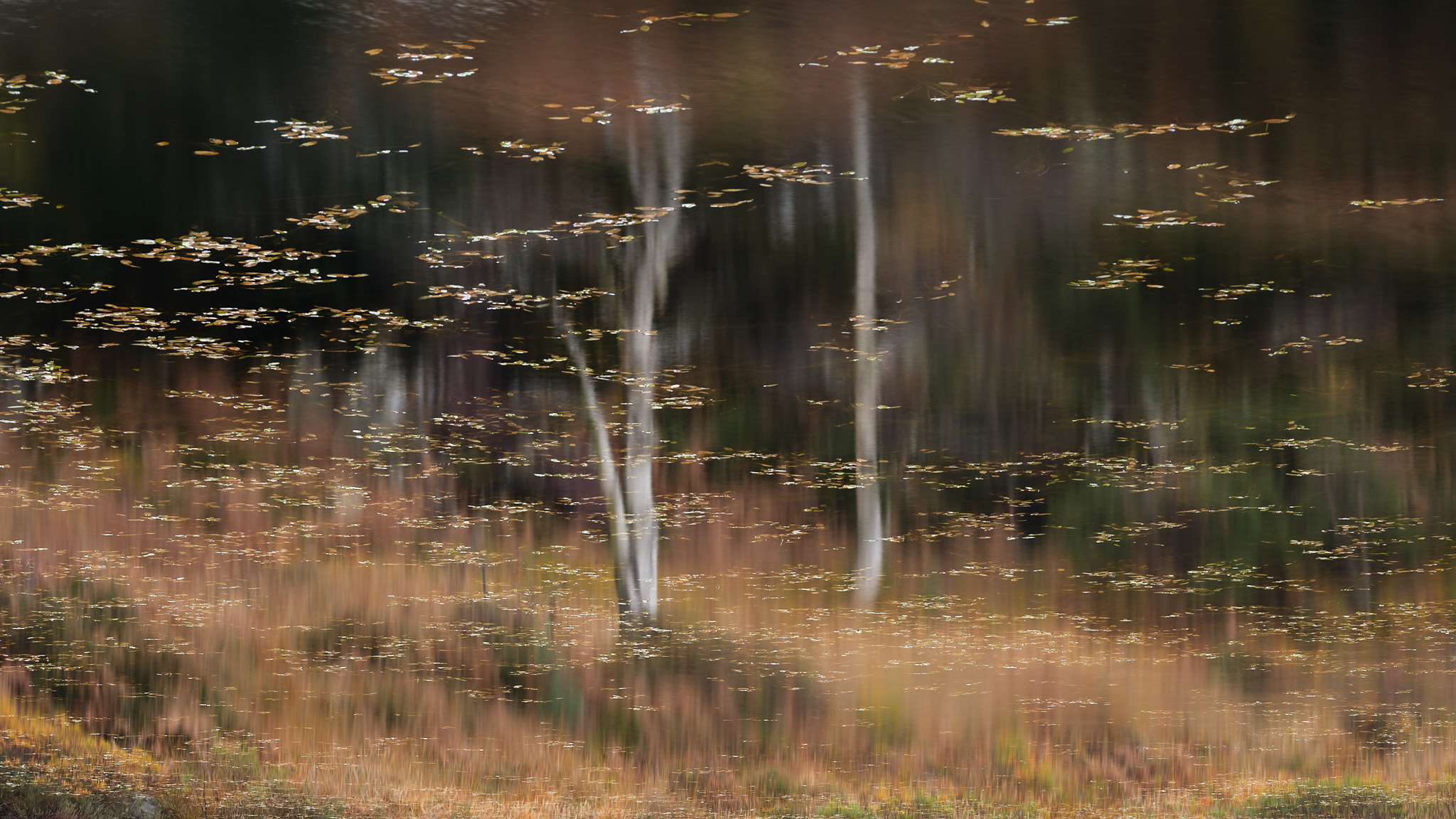 On the far side of the reservoir stand a pair of birch tree stumps, which the water was reflecting quite nicely, so I took a shot of the stumps and their reflection. Although quite pleasing in itself, I was more interested in the reflection than the whole image, so I cropped down to just the reflection and vertically flipped the image to get this abstract shot.