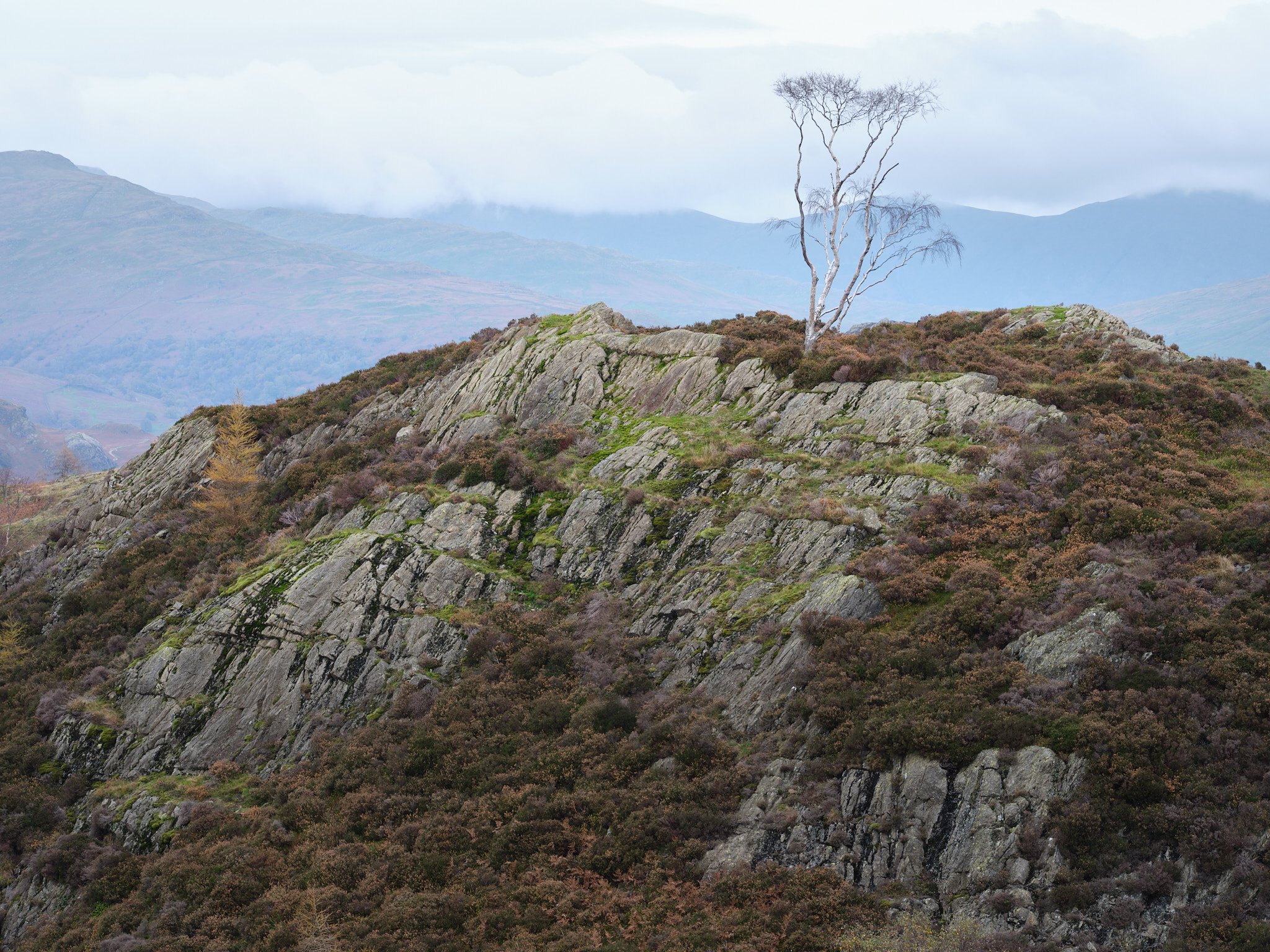 As we continued across Holme Fell, we encountered many little summits, often adorned with a skeletal tree such as this one.