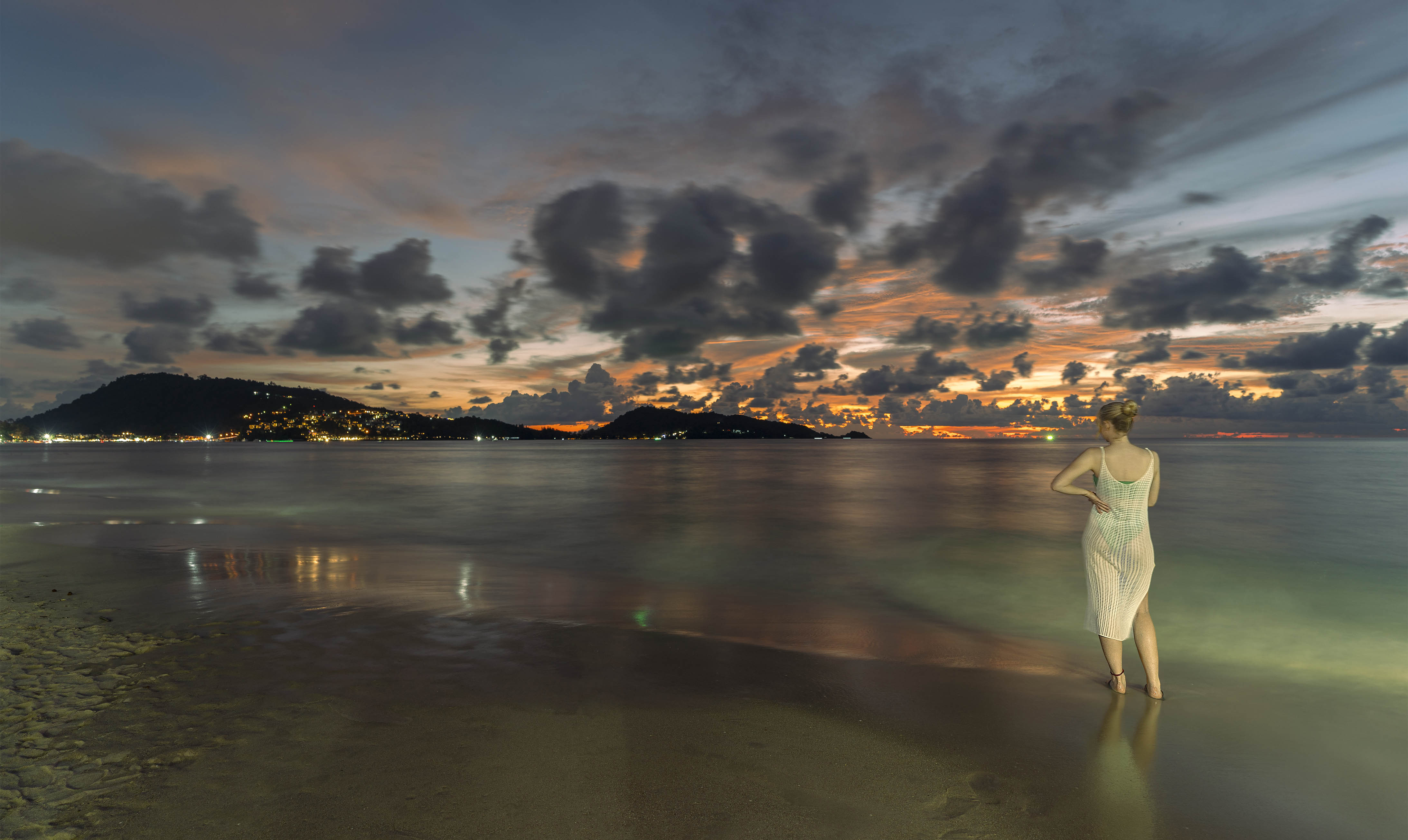 The atmosphere with the setting sun, the clouds, lights and reflections, and of course, the elegance added by your daughter make this really good !