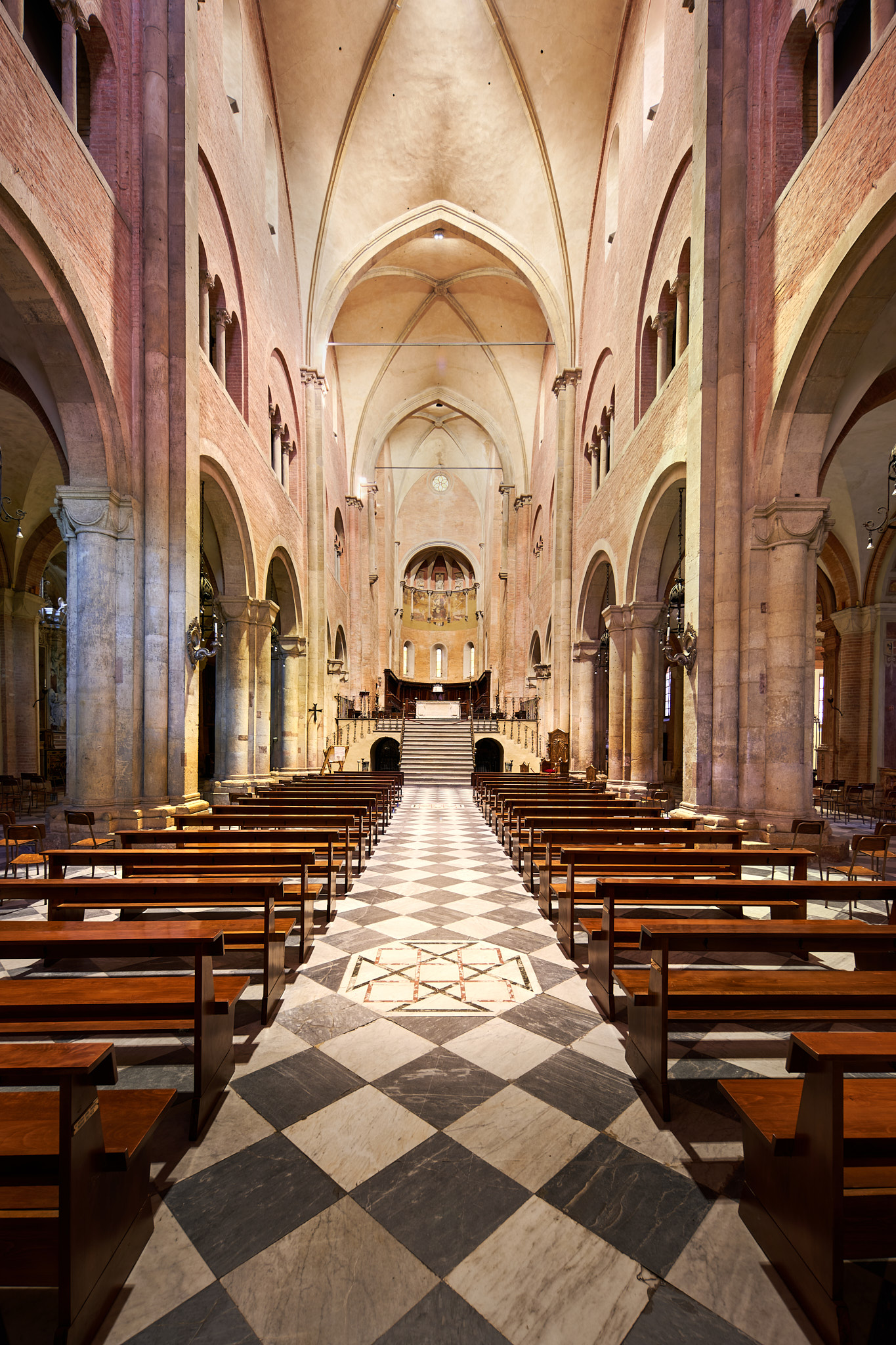 Interesting. The circular window is still circular in this shot so the lens is not deforming and a hyper wide angle should stretch at the edges. I guess the exaggerated perspective effects of the twin towers are playing with perception. But in real life it is quite squat compared to the classic Gothic cathedral, like the nearby Cathedrals in Parma and Piacenza, which are basically fit into a square.